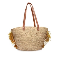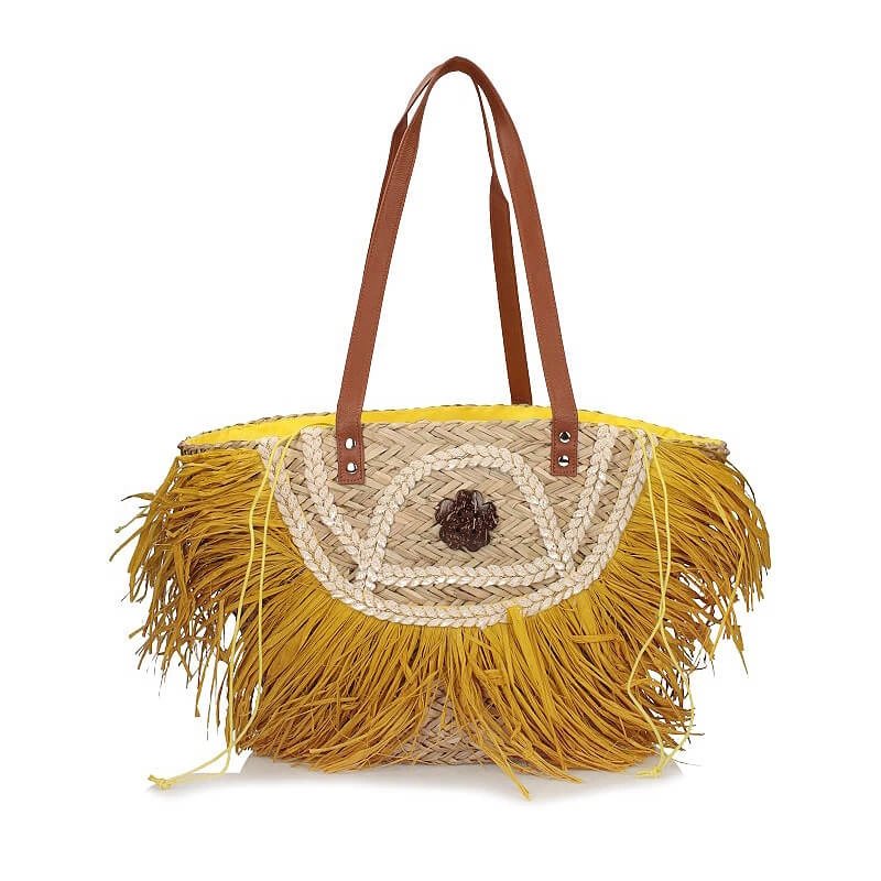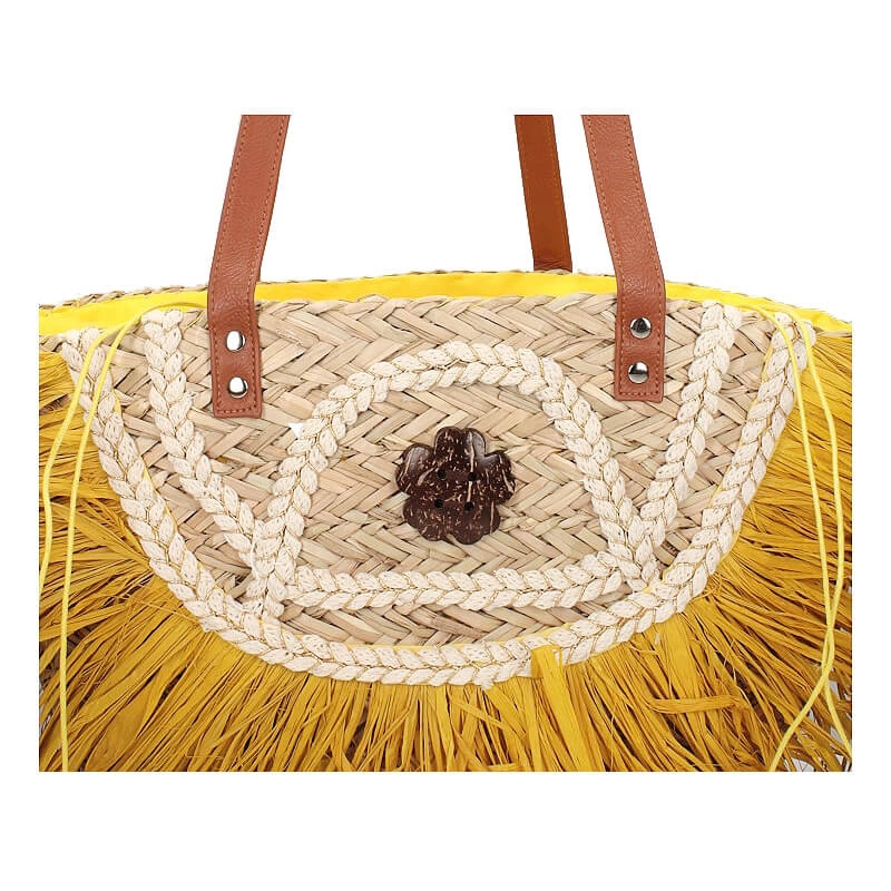 Stylowy kosz znanej i cenionej marki Sca'viola pochodzący z najnowszej kolekcji wiosna - lato. Idealny model dla miłośniczek stylu boho. Duża torba ręcznie wykonana ma szerokie zastosowanie - sprawdzi się w stylu miejskim oraz z przeznaczeniem jako plażowa. Ręcznie pleciona z dbałością o najmniejszy szczegół. U góry ściągacz, który chroni i zabezpiecza przenoszone rzeczy przed wypadaniem czy kradzieżą. Torba posiada dwa solidne uchwyty wykonane z wysokiej jakości skóry ekologicznej w brązowym kolorze. Spod owalny dzięki czemu torba zyskuje na stabilności. Elementami ozdobnymi jest delikatny haft oraz plecionka z bawełnianego sznurka. Uwagę przykuwa przepiękna rafia w żółtym kolorze, która świetnie współgra z pozostałymi kolorami koszyka. Jeśli szukasz praktycznej torby na lato to jest właśnie ten model.