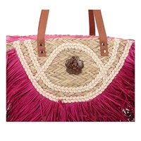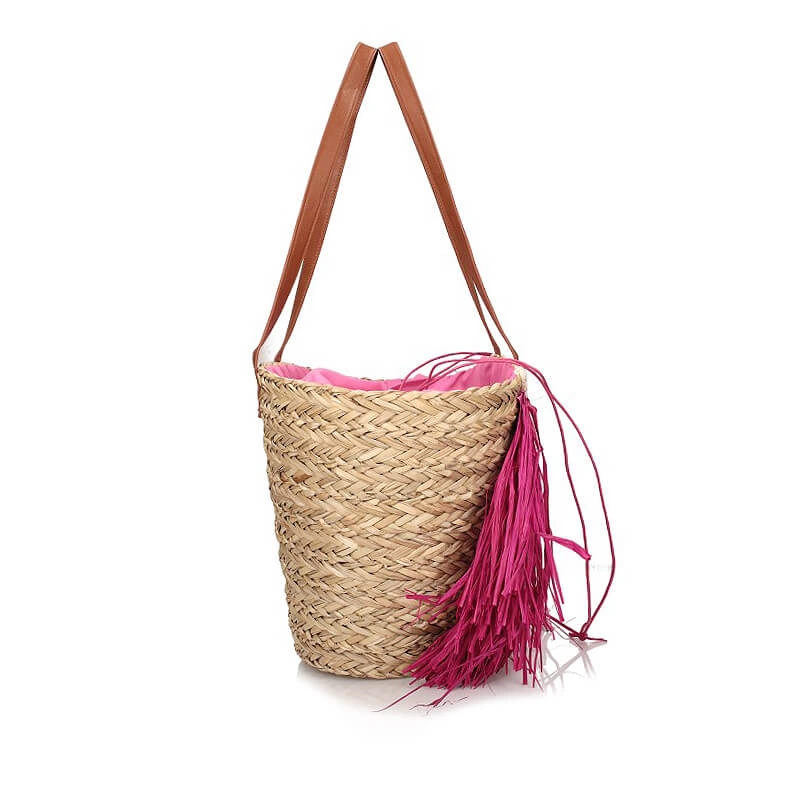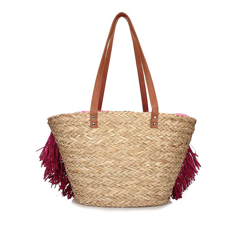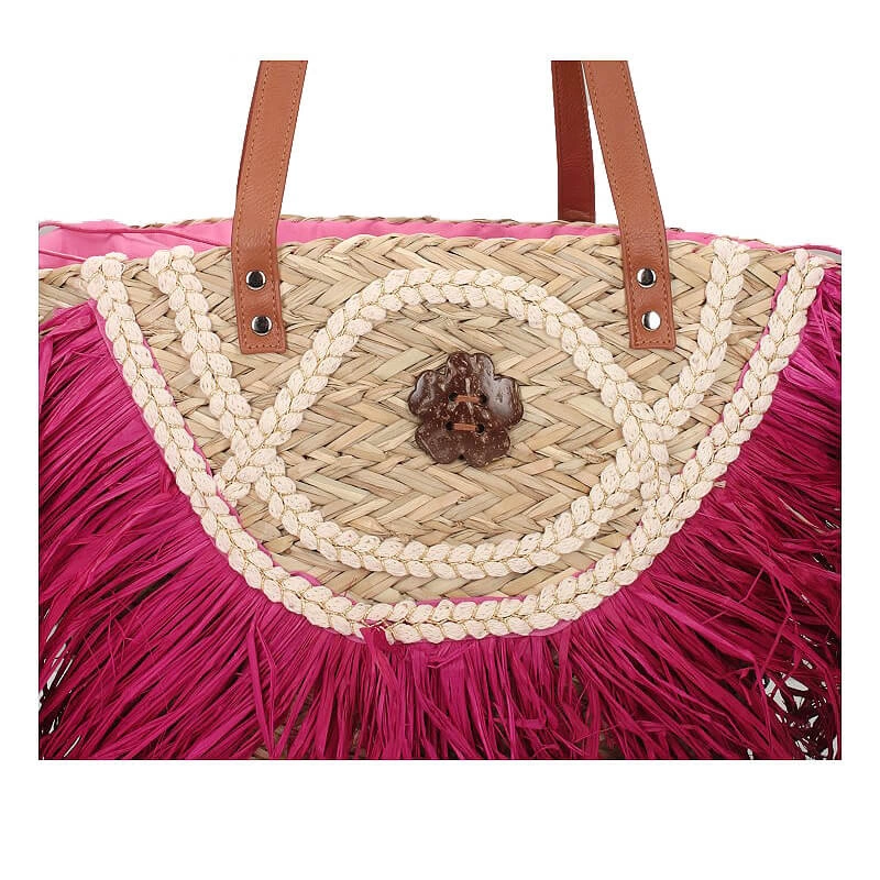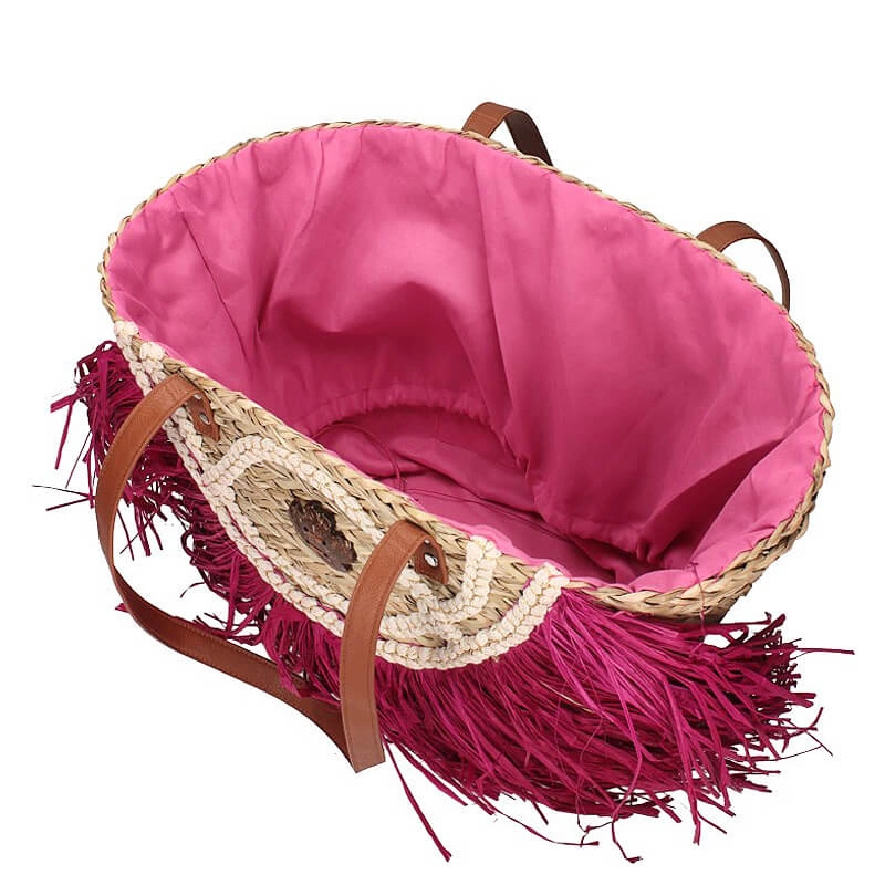 Stylowy kosz znanej i cenionej marki Sca'viola pochodzący z najnowszej kolekcji wiosna - lato. Idealny model dla miłośniczek stylu boho. Duża torba ręcznie wykonana ma szerokie zastosowanie - sprawdzi się w stylu miejskim oraz z przeznaczeniem jako plażowa. Ręcznie pleciona z dbałością o najmniejszy szczegół. U góry ściągacz, który chroni i zabezpiecza przenoszone rzeczy przed wypadaniem czy kradzieżą. Torba posiada dwa solidne uchwyty wykonane z wysokiej jakości skóry ekologicznej w brązowym kolorze. Spod owalny dzięki czemu torba zyskuje na stabilności. Elementami ozdobnymi jest delikatny haft oraz plecionka z bawełnianego sznurka. Uwagę przykuwa przepiękna rafia w kolorze fuksji, która świetnie współgra z pozostałymi kolorami koszyka. Jeśli szukasz praktycznej torby na lato to jest właśnie ten model.