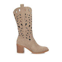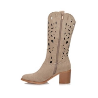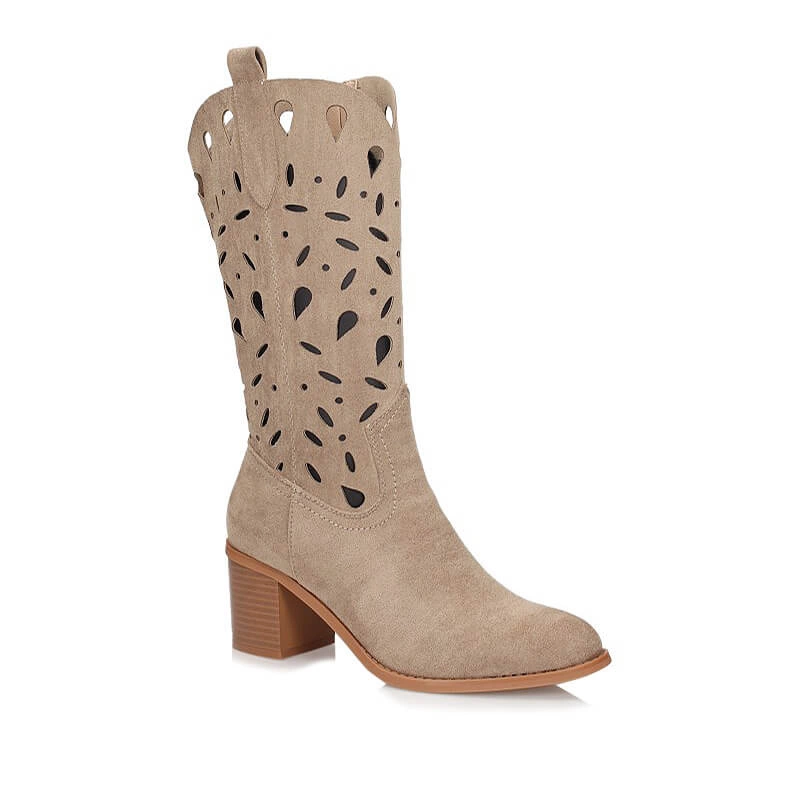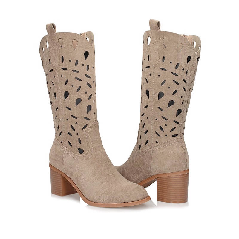Znana i renomowana marka M. Daszyński prezentuje nam kozaki pochodzące z najnowszej kolekcji wiosenno-letniej. Cholewka wykonana z tkaniny w szaro-bezowym kolorze, dolna część pełna, u góry cholewka zdobiona ażurowymi wycięciami. Zapinane na zamek, który ułatwia zdejmowanie i zakładanie. Nosek zaokrąglony, lekko uniesiony ku górze. Świetne uzupełnienie wielu stylizacji. Stabilny obcas o wysokości 6 cm zapewnia komfort i stabilność każdego kroku. Wewnątrz wkładka wykonana z naturalnej skóry, boki wyściełane tkaniną. Podeszwa wykonana z tworzywa.