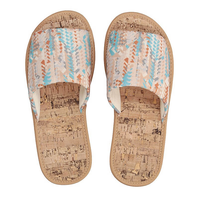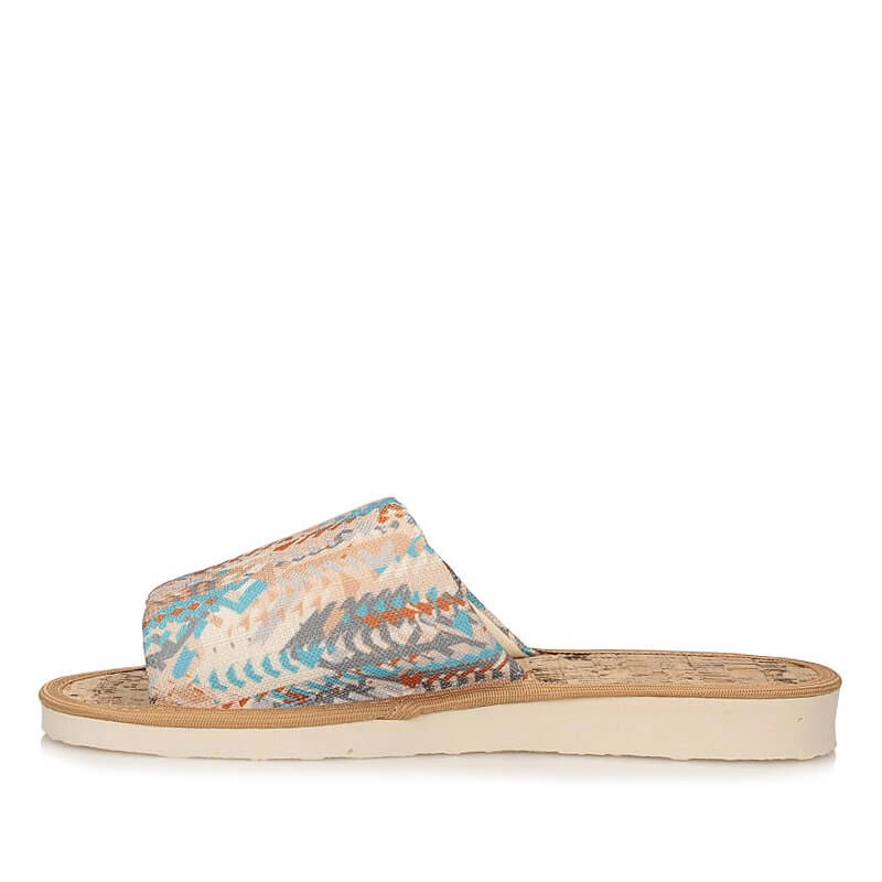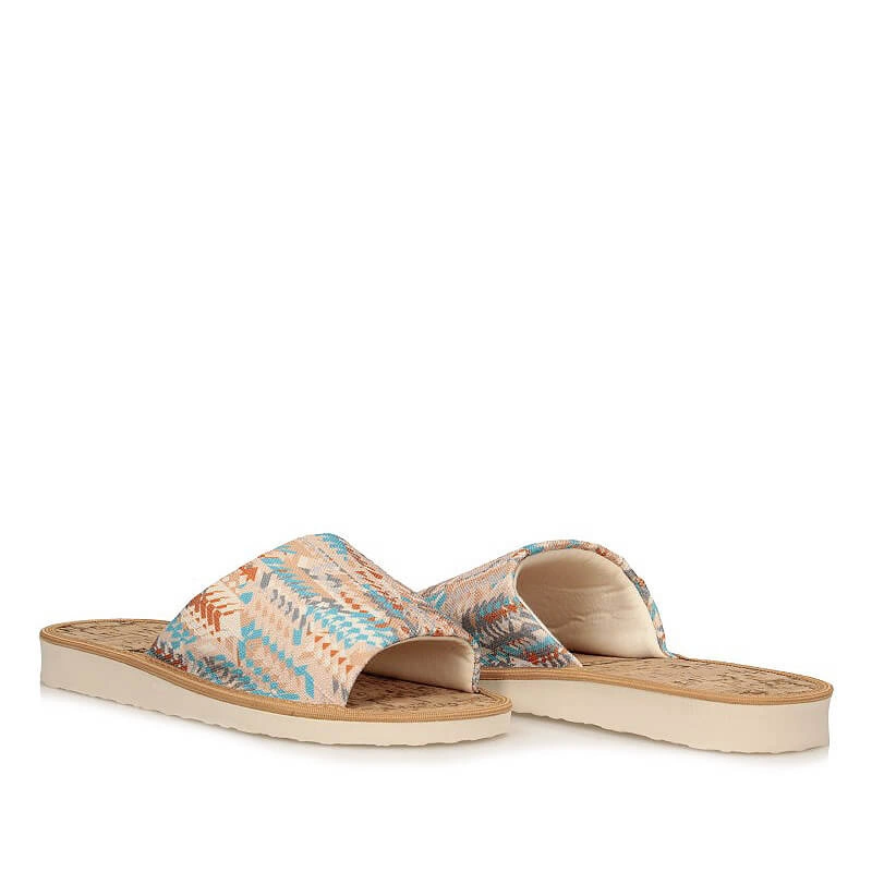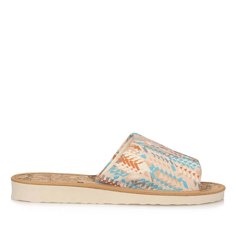 Znana marka Meteor przedstawia kolorowe, wzorzyste kapcie wykonane z wysokogatunkowego materiału tekstylnego. Wnętrze zrobiono natomiast z naturalnego korku. Dzięki temu, że nosek jest wycięty możemy swobodnie ułożyć palce. Płaska, trwała i odporna na ścieranie podeszwa pozwoli na stawianie stabilnych i pewnych kroków. Idealnie sprawdzą się do noszenia w domu.