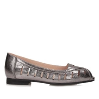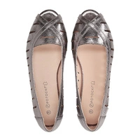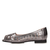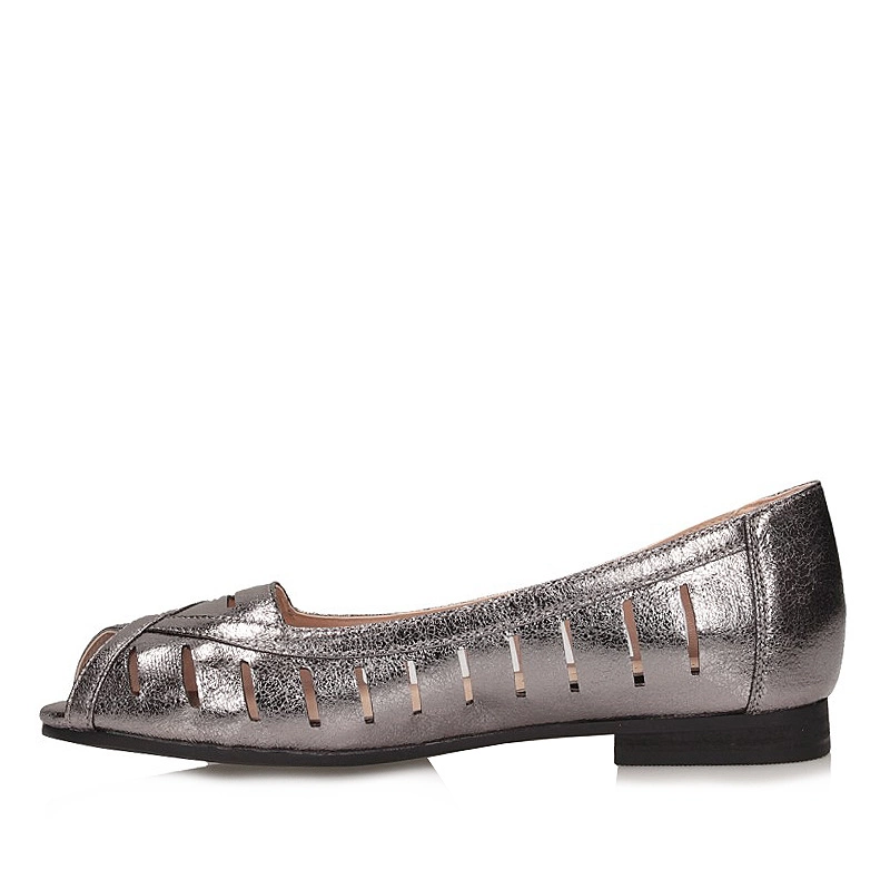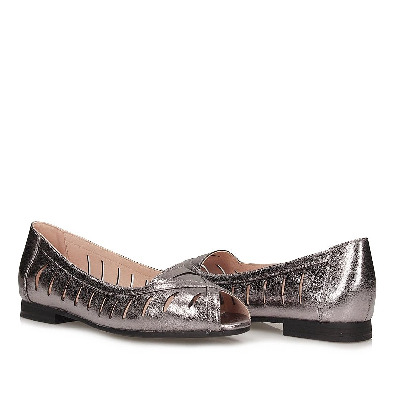 Balerinki znanej marki Potocki pochodzące z najnowszej kolekcji. Buty wykonane zostały ze skóry ekologicznej w kolorze srebrnym. Wkładka również wykonana została ze skóry. Buty posiadają delikatne wycięcia na bokach cholewki. Nosek wycięty, dzięki czemu rozłożymy wygodnie palce. Podeszwa zrobiona z tworzywa sztucznego odpornego na ścieranie. Balerinki na płaskim obcasie o wysokości 2 cm. Ten model idealnie sprawdzi się na lato.