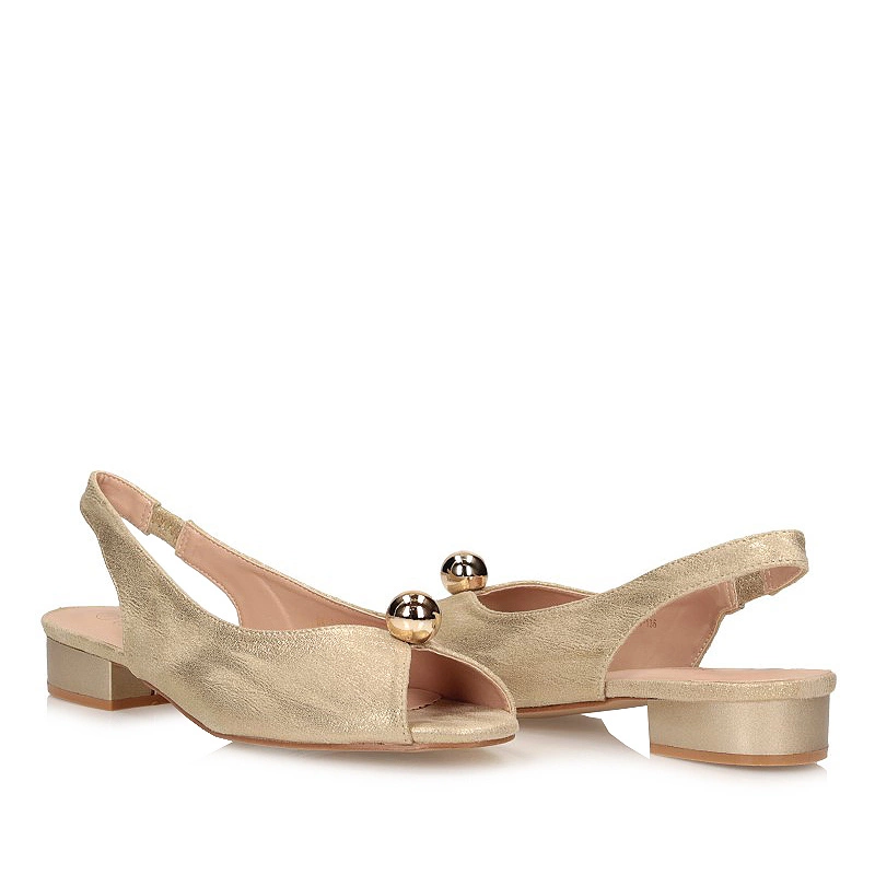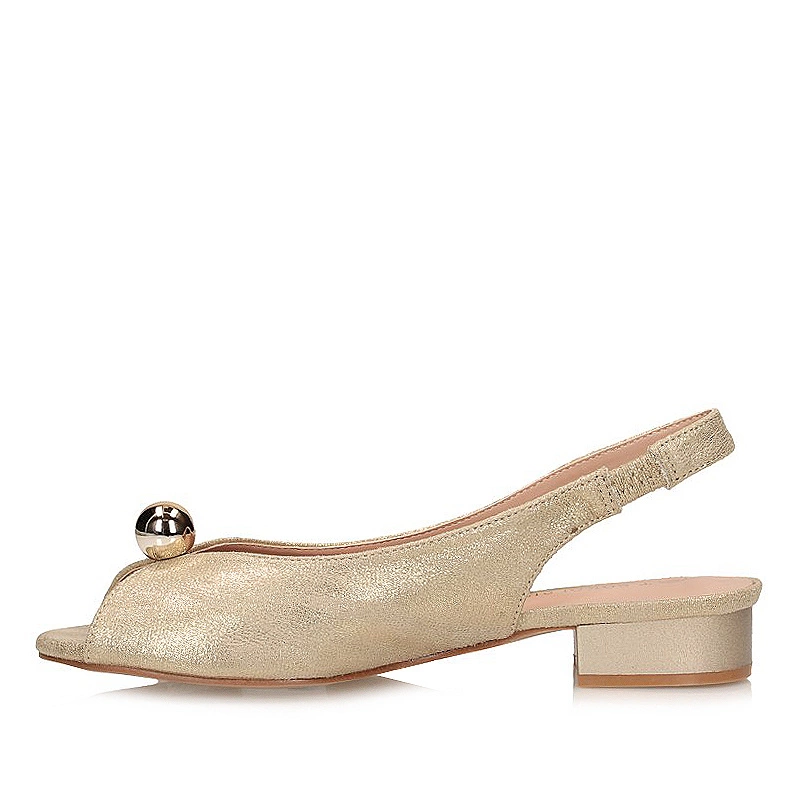 Najnowsze sandały marki T.Sokolski to propozycja dla Pań lubiących elegancki styl i jednocześnie stawiających na wygodę. Cholewka wykonana z wysokogatunkowej tkaniny w złotym kolorze. Na przodzie imitacja złotej kuleczki, która jest formą delikatnej ozdoby. Stabilny obcas o wysokości 2,5 cm. Przy pięcie wszyta gumka która ułatwia dopasowanie tęgości do stopy oraz zapewnia stabilność podczas użytkowania. Wkładka z ekologicznej skóry, podeszwa z tworzywa. Idealny fason do zwiewnych letnich sukienek, eleganckich kreacji lub jeansów.