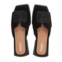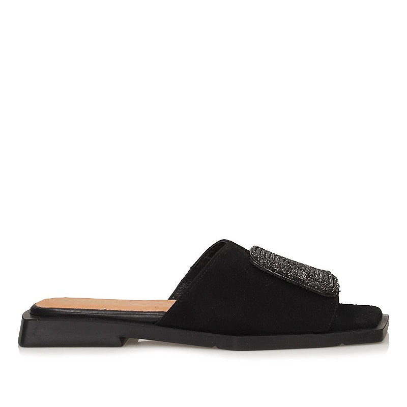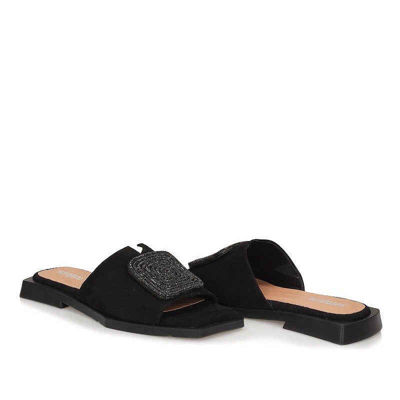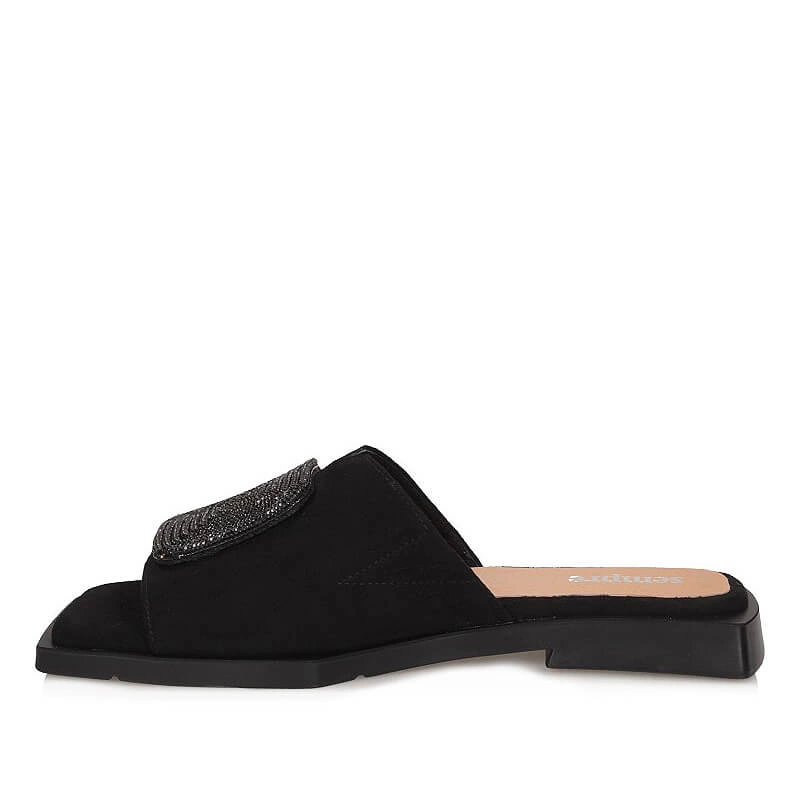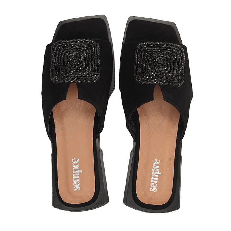 Oryginalny model damskiego klapka przedstawia marka Sempre. Cholewka wykonana z najwyższej jakości naturalnego zamszu w klasycznym czarnym kolorze. Na przodzie kwadratowa ozdoba z mieniącymi się cekinami dodatkowo wzmacnia efekt wizualny obuwia. Nosek szerszy, kwadratowy idealnie wpisuje się w modowe trendy w sezonie wiosna - lato. Wnętrze całościowo wyściełane naturalną skórą, dodatkowo wkładka podklejona miękką pianką dla zwiększenia wygody podczas użytkowania. Podeszwa wykonana z tworzywa. Prezentowany fason wykonany jest z dbałością o najmniejszy szczegół.