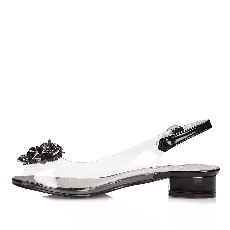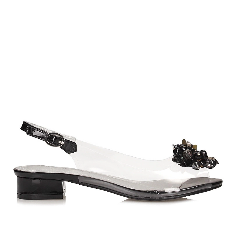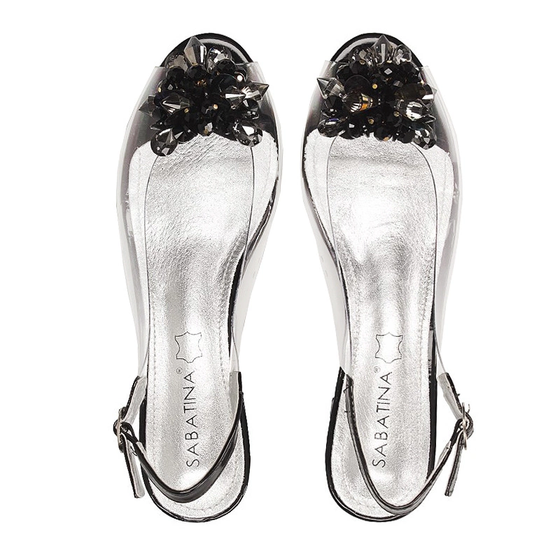 Sandały znanej marki Sabatina pochodzące z najnowszej kolekcji. Obuwie zostało wykonane z wysokiej jakości tworzywa sztucznego silikonowego, nie odparzającego i nie powodującego otarć w kolorze czarnym. Wkładka delikatna wykonana z skóry naturalnej zapewni nam odpowiedni komfort podczas użytkowaniu. Podeszwa wykonana z wysokogatunkowego tworzywa sztucznego z właściwościami odpornymi na ścieranie. Nosek odkryty, dzięki czemu możemy swobodnie rozłożyć palce. Całość osadzona została na 3 centymetrowym obcasie. Obuwie zapinane na sprzączkę wokół nogi. Na cholewce umieszczono ozdobne cyrkonie. Jest to model sandałów w stylu marki Sca'viola.