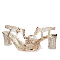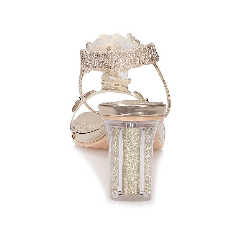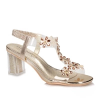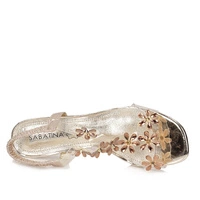 Sandały znanej marki Sabatina pochodzące z najnowszej kolekcji. Powyższy model wykonany został z silikonu, natomiast wkładka ze skóry naturalnej. Sandałki są w kolorze złotym. Przód obuwia zdobią złote kwiatki wykonane z cekinów. Model jest wsuwany co umożliwia szybkie założenie jak i zdjęcie go. Dodatkowym atutem jest gumka z tyłu, dzięki której dopasujemy but do naszej stopy. Całość osadzona na 8 cm korku.