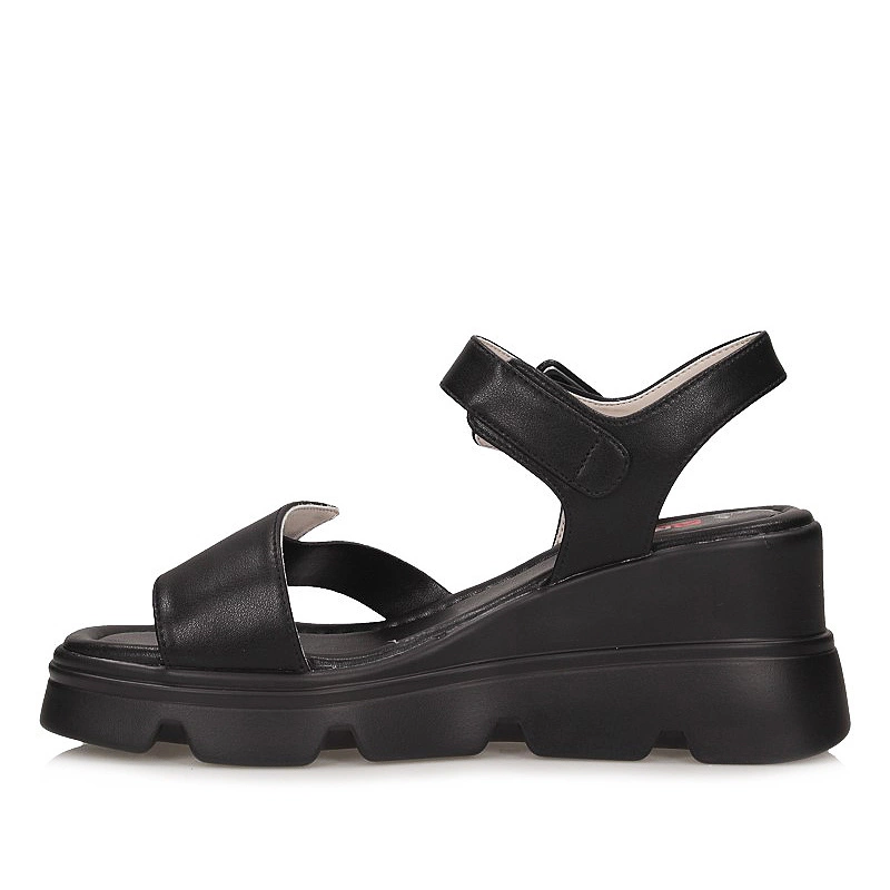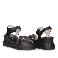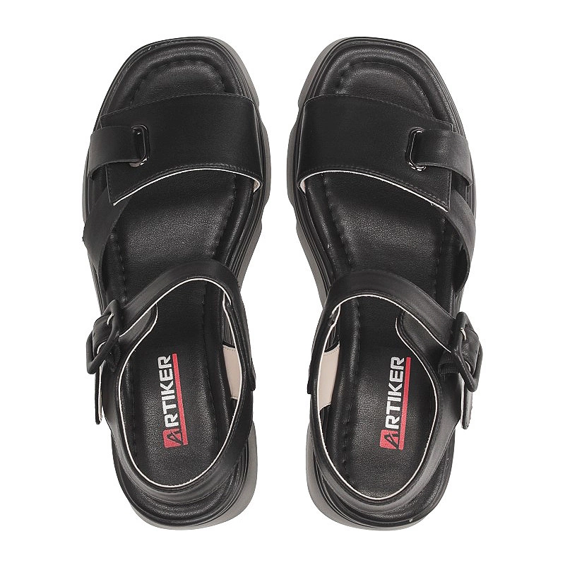 Sandały znanej marki Artiker pochodzące z najnowszej kolekcji. Cholewkę obuwia wykonano z najwyższej jakości skóry naturalnej w odcieniu klasycznej czerni. Wnętrze buta zostało wyściełane delikatną dla stóp wkładką ze skóry naturalnej, która zapewni wygodę oraz komfort podczas całodziennego użytkowania. Model posiada zapięcie na sprzączkę, co ułatwi nam szybkie zakładanie oraz zdejmowanie obuwia. Fason oparty na stabilnym koturnie. Antypoślizgowa oraz odporna na ścieranie podeszwa wykonana z wysokogatunkowego tworzywa sztucznego. Model sandałków dzięki swojemu oryginalnemu kolorowi dopasujemy do wielu wiosenno-letnich stylizacji.
