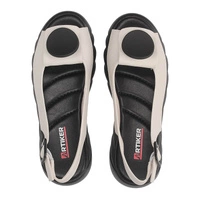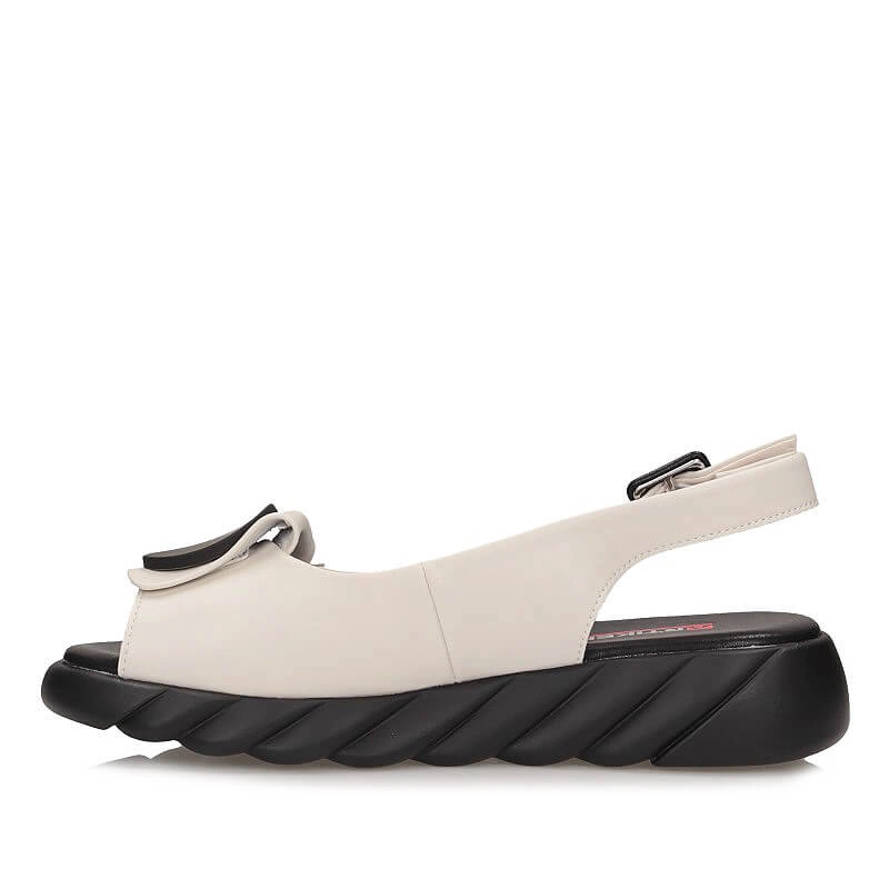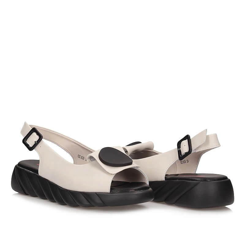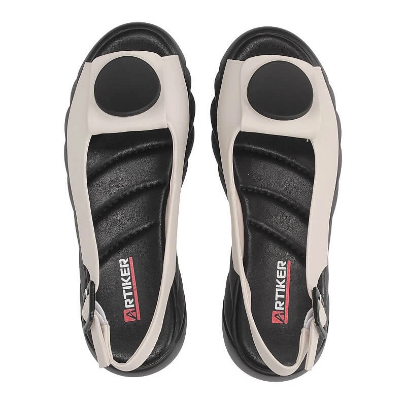 Sandały znanej marki Artiker pochodzące z najnowszej kolekcji. Miękka cholewka została wykonana ze skóry ekologicznej w kolorze beżowym. Model dopasuje się do indywidualnego kształtu stopy klienta. Na przodzie subtelna ozdoba w postaci czarnego koła. Z boku pięty umieszczona spinka, która zapewnia odpowiednie dopasowanie tęgości. Wnętrze wyściełane ekologiczną skórą, wkładka dodatkowo podklejona miękką pianką. Platforma w czarnym kolorze o grubości 3,5 cm amortyzuje wstrząsy od podłoża. Idealny model zarówno do jeansów jak i letnich sukienek.