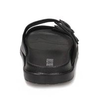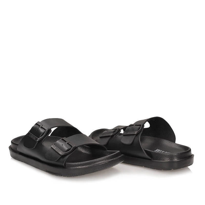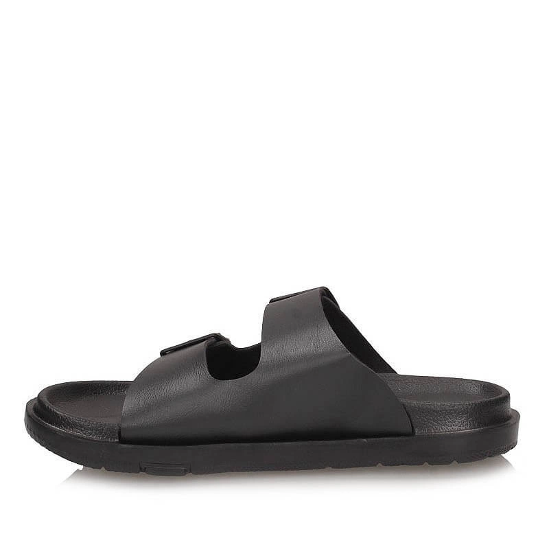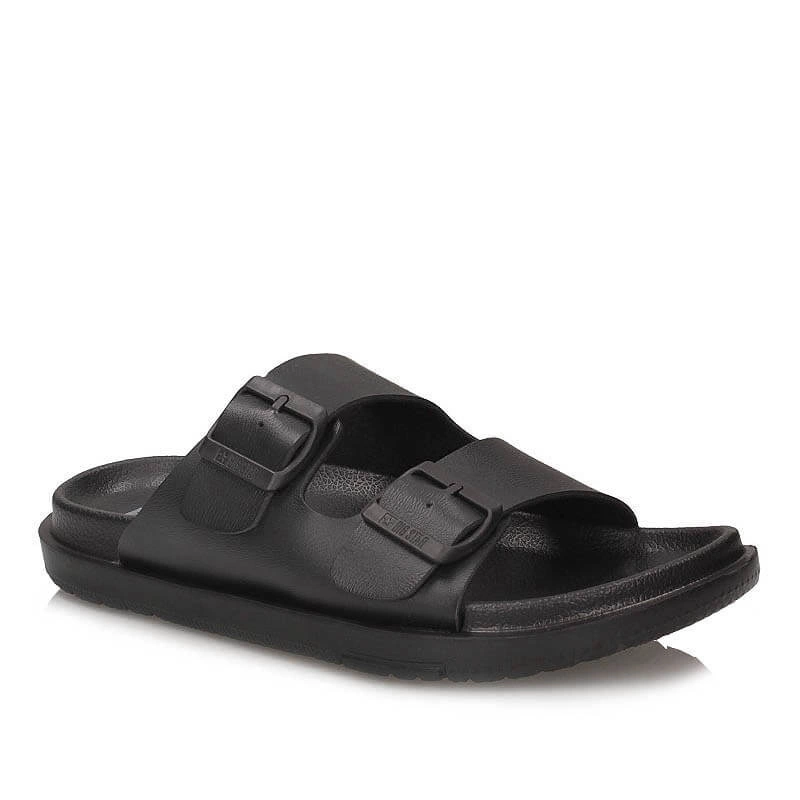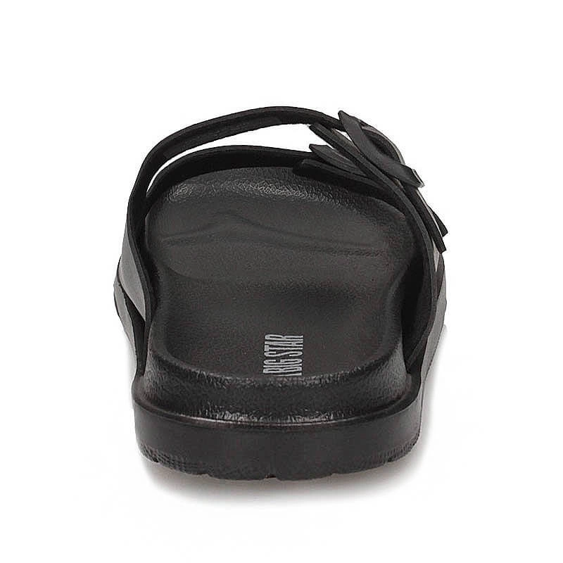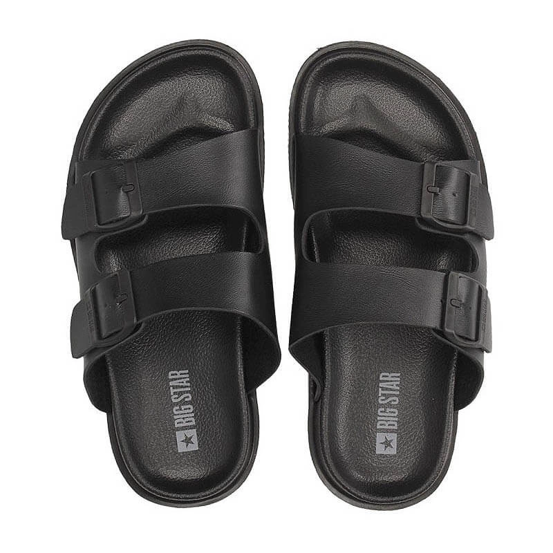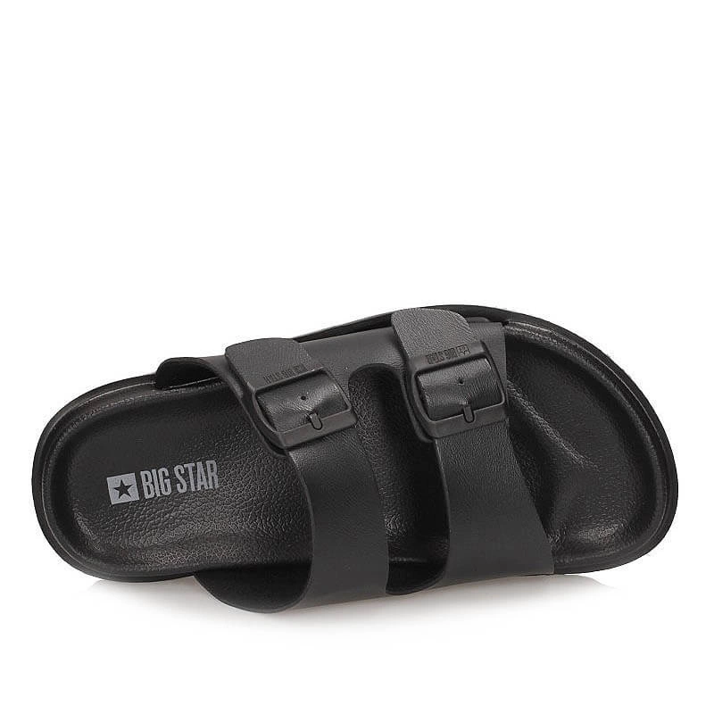 Klapki znanej polskiej marki Big Star pochodzące z najnowszej kolekcji wykonane zostały z wysokogatunkowego tworzywa sztucznego w kolorze czarnym. Paski znajdujące się na obuwiu przyozdobione zostały klamrami. Na wkładce jak i klamrach widnieje logo marki. Całość osadzona na platformie o wysokości 2.5 cm. Podeszwa jest trwała oraz odporna na ścieranie.
