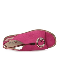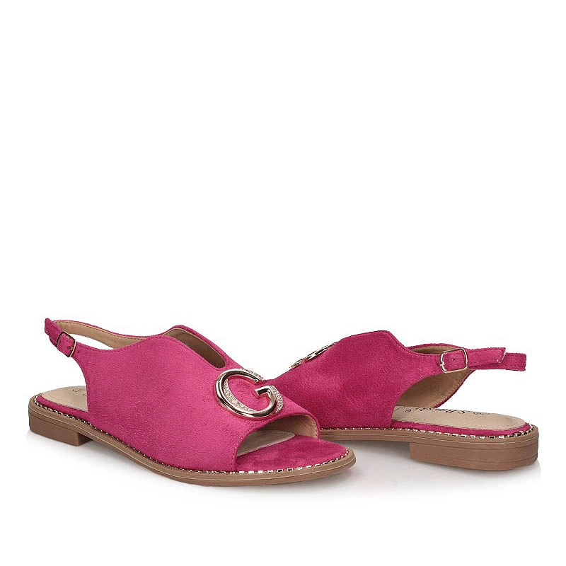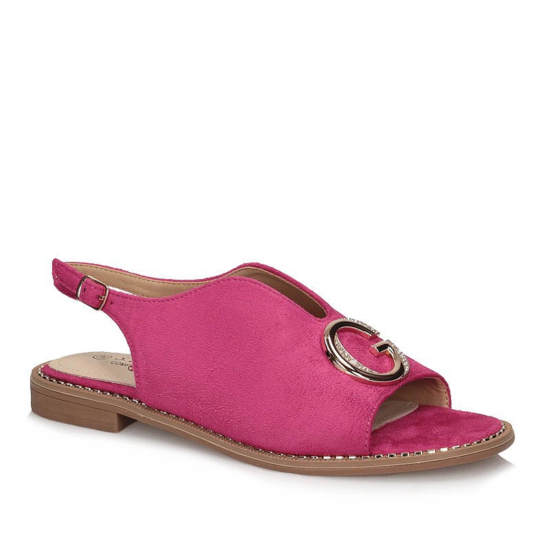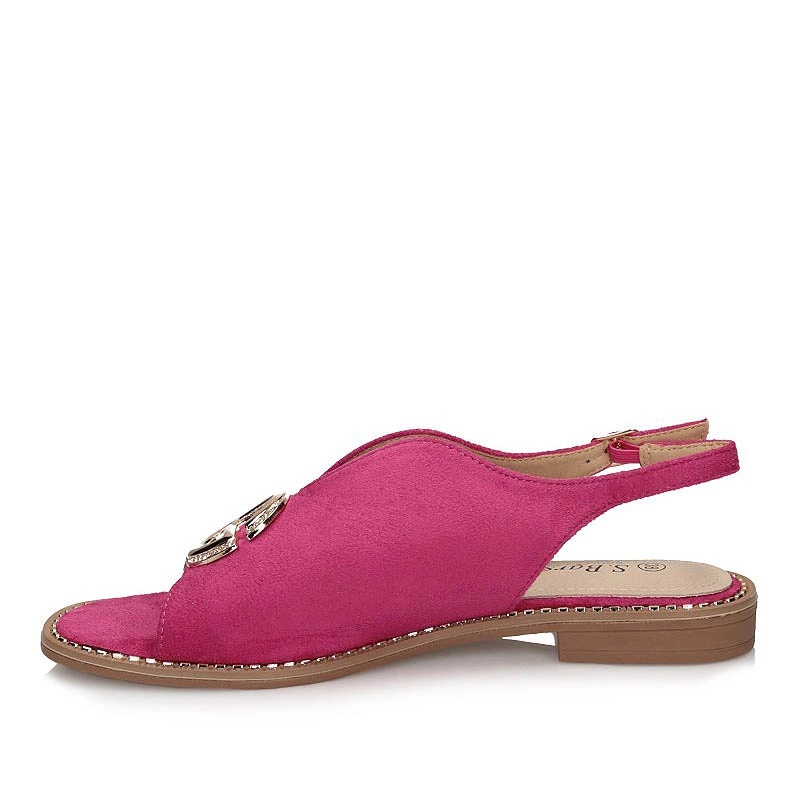 Sandały znanej marki S.Barski pochodzące z najnowszej kolekcji. Cholewka obuwia wykonana z tkaniny w kolorze różowo-złotym. Wkładka obuwia wykonana z skóry ekologicznej. Wszystko utrzymuje się na płaskiej podeszwie ozdobionej cyrkoniami. Na środku obuwia mała ozdoba dodająca oryginalności. Wszystko zapięte na sprzączkę.
