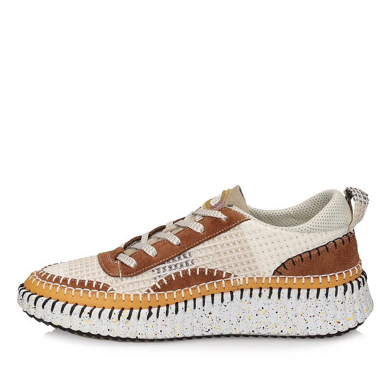 Sneakersy znanej marki Loretta Vitale pochodzące z najnowszej kolekcji. Zostały wykonane z wysokiej jakości skóry naturalnej zamszowej w odcieniach beżu. Nosek okrągły pozwalający na swobodne rozłożenie palców. Wkładka wykonana z tkaniny odpowiadająca za wygodę naszych stóp. Tradycyjne sznurowanie umożliwia idealne dopasowanie obuwia do tęgości stóp. Podeszwa wykonana z trwałego tworzywa sztucznego. Idealnie będą pasować do wielu stylizacji wiosenno-letnich.