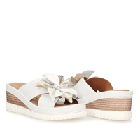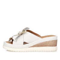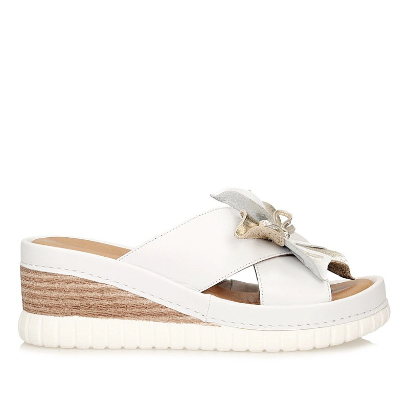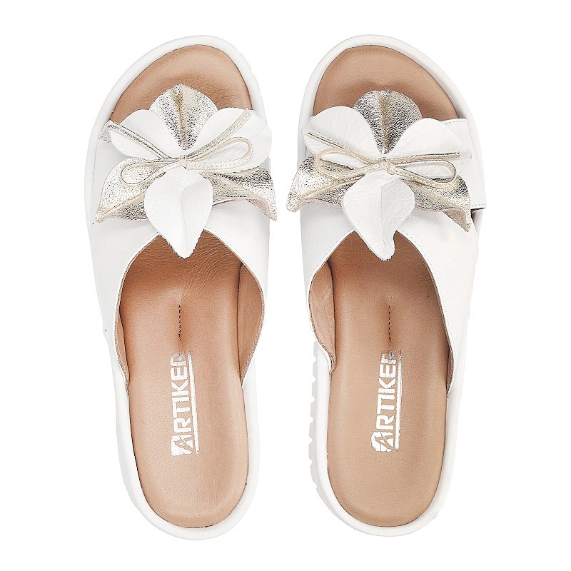 Klapki znanej i lubianej marki Artiker pochodzące z najnowszej kolekcji. Model w odcieniu klasycznej bieli wykonany został z wysokiej jakości skóry naturalnej licowej. Nosek odkryty dzięki czemu możemy swobodnie rozłożyć palce. Wkładka oraz wnętrze wykonane ze skóry naturalnej, która zapewni komfort oraz wygodę podczas całodziennego użytkowania. Model wsuwany pozwalający na szybkie zakładanie. Fason osadzony na stabilnym 6 cm koturnie. Podeszwa wykonana z wysokogatunkowego tworzywa sztucznego. Prezentowany model klapek uzupełni wiele kobiecych stylizacji.