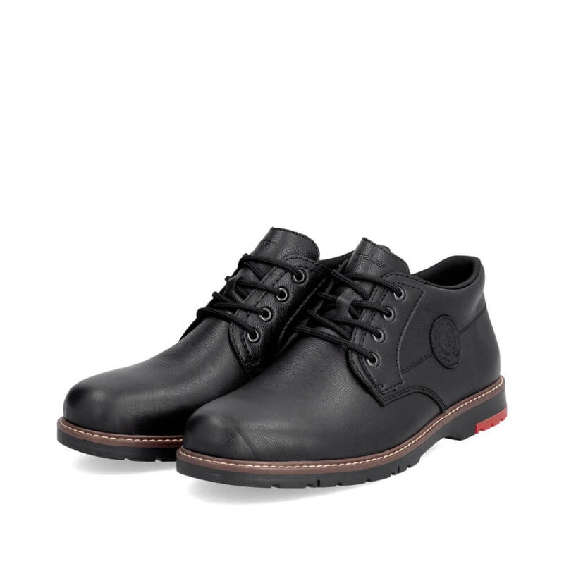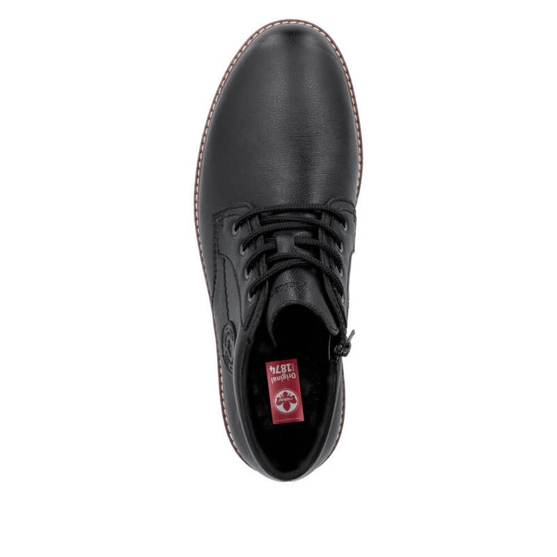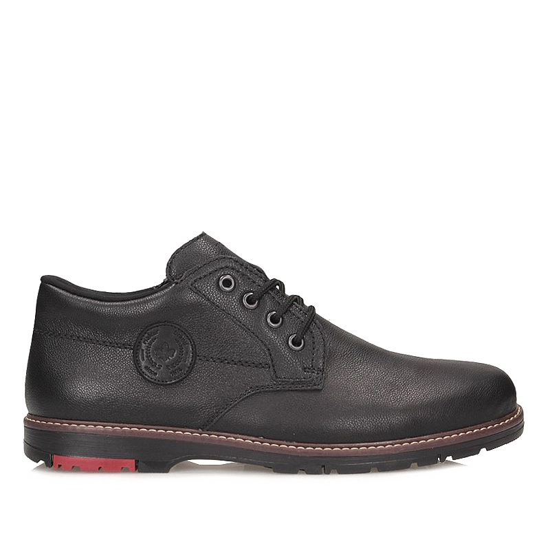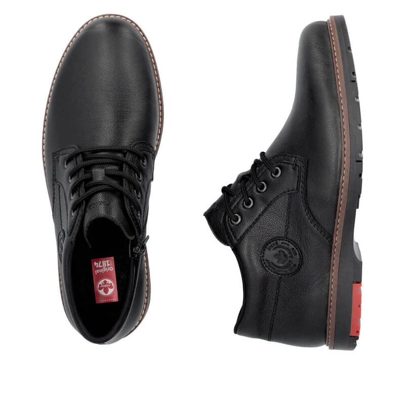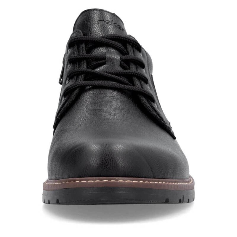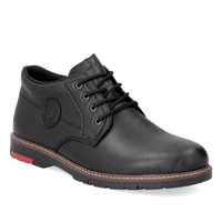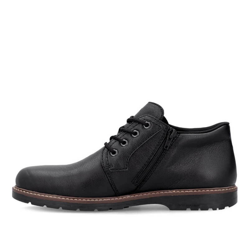 Męskie półbuty z najnowszej kolekcji jesienno-zimowej prezentuje nam znana oraz ceniona niemiecka marka Rieker. Obuwie wykonane z najwyższej jakości skóry naturalnej licowej w odcieniu klasycznej czerni. Nosek szerszy, lekko uniesiony ku górze pozwoli swobodnie rozłożyć palce. Wnętrze wyściełano przyjemnym dla stopy filcem, który zapewni nam ciepło podczas chłodnych dni. Model sznurowany na 4 dziurki oraz zapinany na zamek. Odporna na ścieranie podeszwa została wykonana z tworzywa sztucznego.