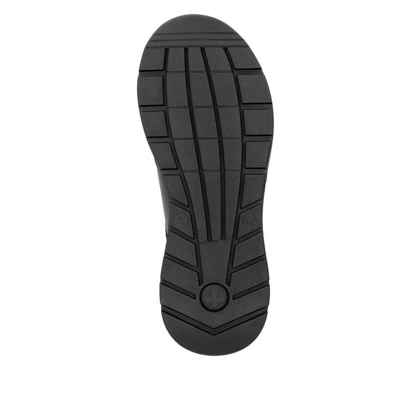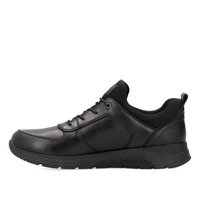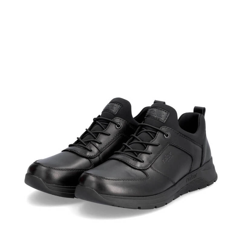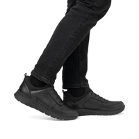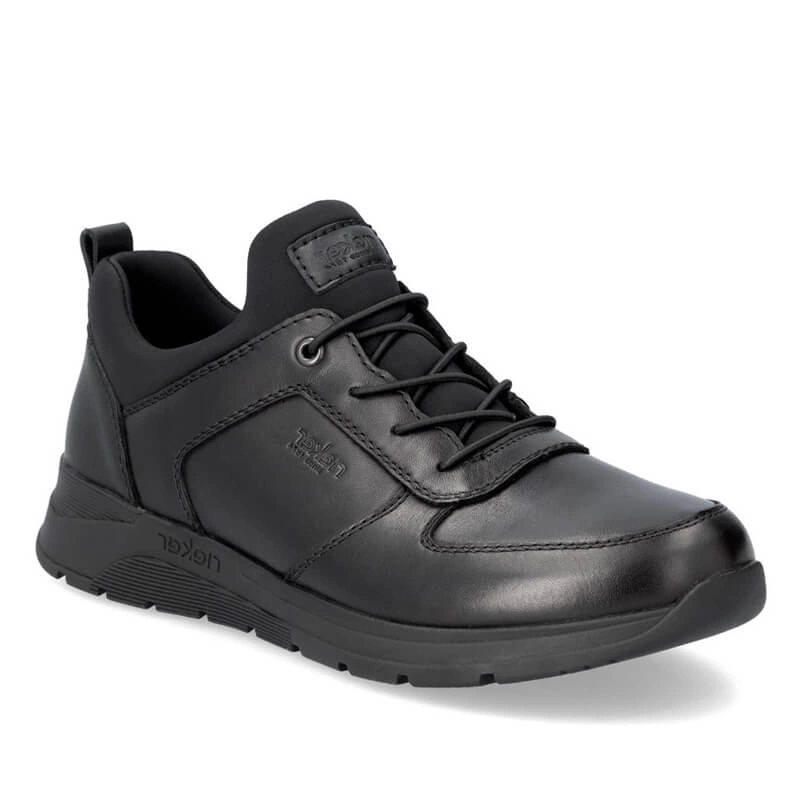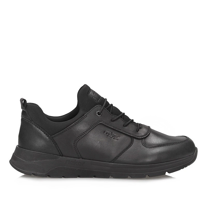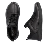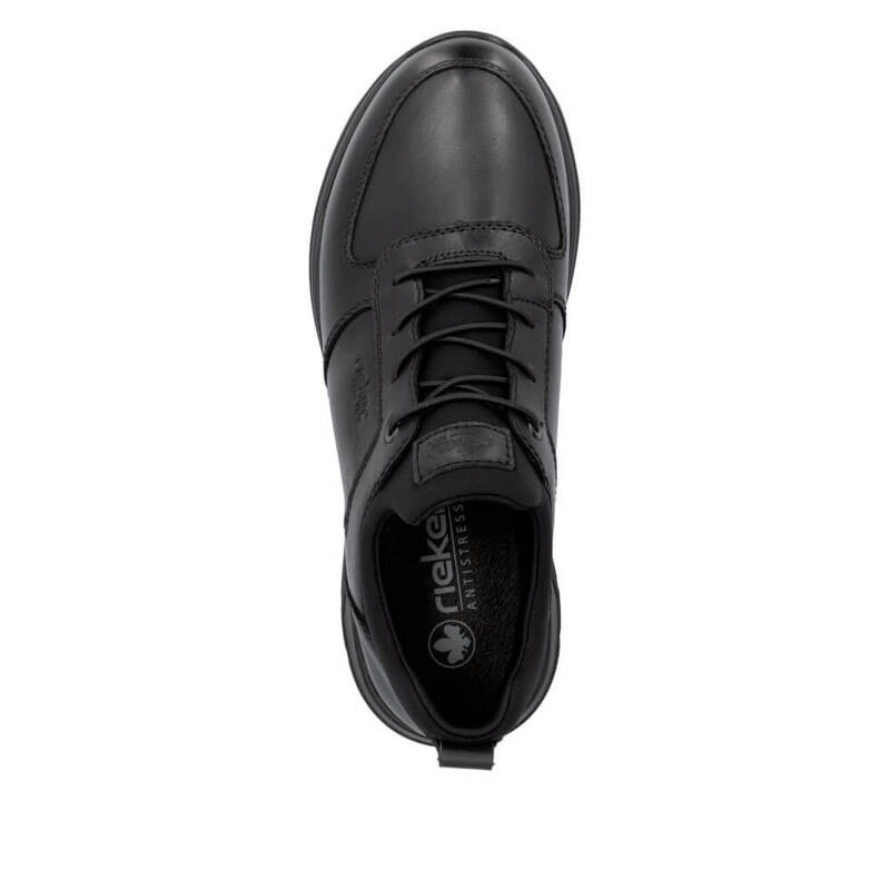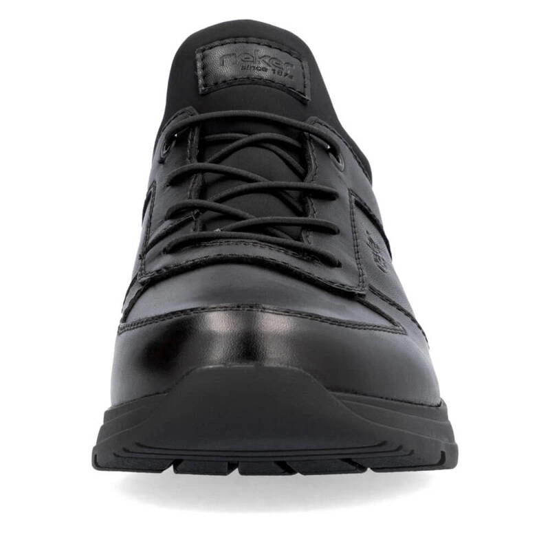 Półbut męski Rieker pochodzący z najnowszej kolekcji jesień-zima. Cholewka w kolorze czarnym w całości wykonana ze skóry naturalnej licowej. Fason wiązany na 4 dziurki pozwala dopasować obuwie do potrzeb użytkownika, dzięki czemu obuwie jest bardzo wygodne i praktyczne. Nosek szerszy, lekko zaokrąglony, zapewni poczucie komfortu i swobody. Wkładka została pokryta miękką skórą naturalną, która zapewni wygodę podczas całodziennego użytkowania. Półbuty przy kostce wykończone są tkaniną ,która zapobiega otarciom i ułatwia zakładanie obuwia. Podeszwę wykonano z wysokogatunkowego tworzywa sztucznego.