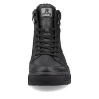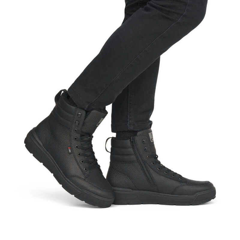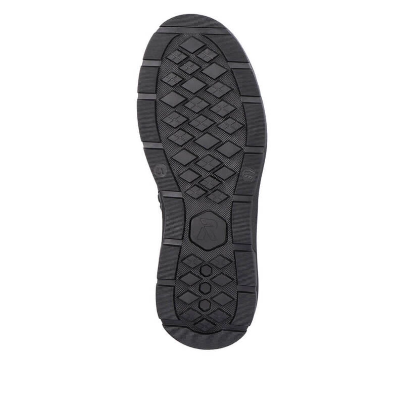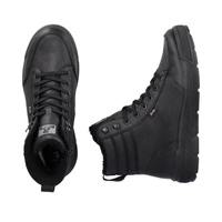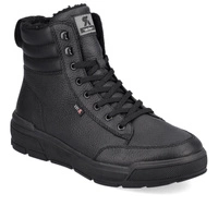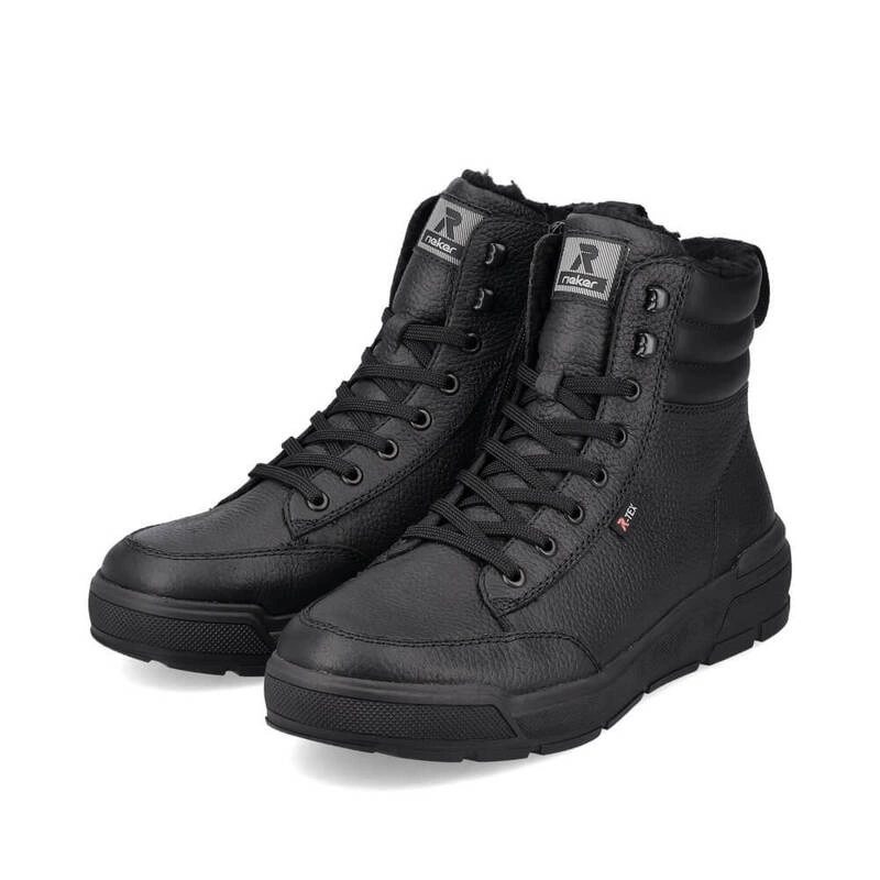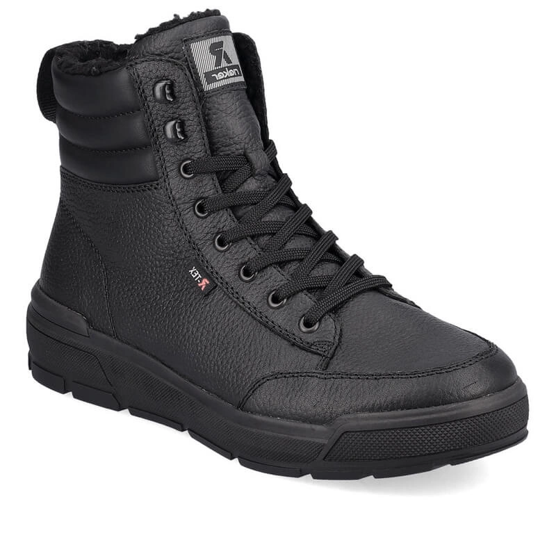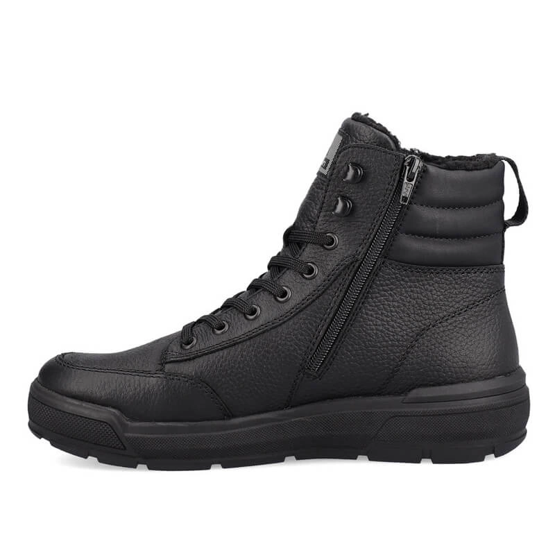 W codzienne, zimowe stylizację świetnie wpiszą się nowe trzewiki w odcieniu czerni marki Rieker. Cholewka wykonana z wysokiej jakości skóry naturalnej licowej. Nosek obuwia szeroki, lekko uniesiony ku górze zapewnia swobodne rozłożenie palców. Model sznurowany na 8 dziurek umożliwi dopasowanie obuwia do każdego rodzaju tęgości stopy. Wnętrze ocieplone, by podczas nawet największych mrozów zapewnić naszym stopom odpowiednią temperaturę. Zamek po wewnętrznej stronie sprawia, że botki się bardzo wygodnie zakłada. Solidna, pogrubiona podeszwa wykonana z tworzywa sztucznego. Fason z pewnością przypadnie do gustów wielu Panom.