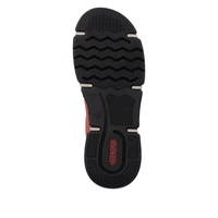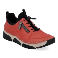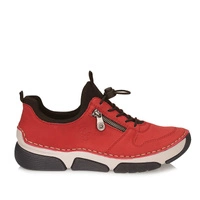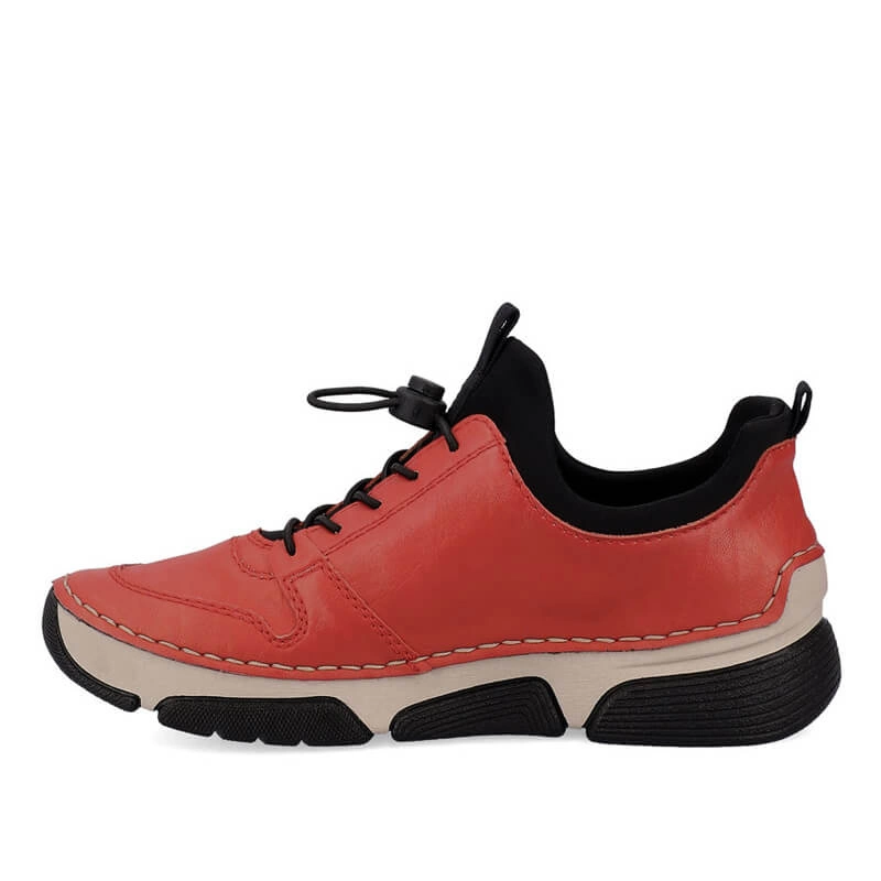 Półbuty damskie niemieckiej marki Rieker pochodzące z najnowszej kolekcji jesień-zima. Cholewka wykonana ze skóry ekologicznej nubukowej w czerwonym odcieniu. Model zapinany na praktyczne regulowane gumki co pozwala na dopasowanie obuwia do różnej tęgości stopy. Nosek zaokrąglony, lekko podniesiony ku górze pozwalający swobodnie rozłożyć palce. Do wykonania miękkiej i komfortowej wkładki użyto wysokiej jakości skóry naturalnej. Elastyczna podeszwa świetnie dopasowuję się do ruchów stopy, wykonana z wysokogatunkowego tworzywa sztucznego. Ozdobny zamek umieszczony po zewnętrznej stronie obuwia dodaje im oryginalnego wyglądu.