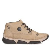 Botki damskie niemieckiej marki Rieker pochodzące z najnowszej kolekcji jesień-zima. Cholewka wykonana ze skóry ekologicznej w jasnobeżowym kolorze. Model wyposażony w tradycyjne sznurowanie na 4 dziurki, co pozwala na swobodne dopasowanie obuwia do różnej tęgości stopy. Środek wyściełany został przyjemnym dla stopy filcem, który zapewni ciepło podczas chłodnych dni. Podeszwa antypoślizgowa wykonana z trwałego tworzywa sztucznego. Logo firmy umieszczone po zewnętrznej stronie obuwia dodaje im oryginalnego wyglądu. Idealnie sprawdzą się w codziennym użytkowaniu.