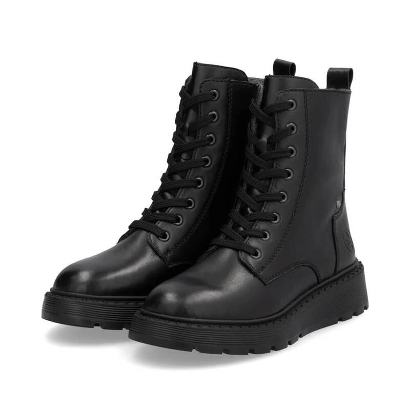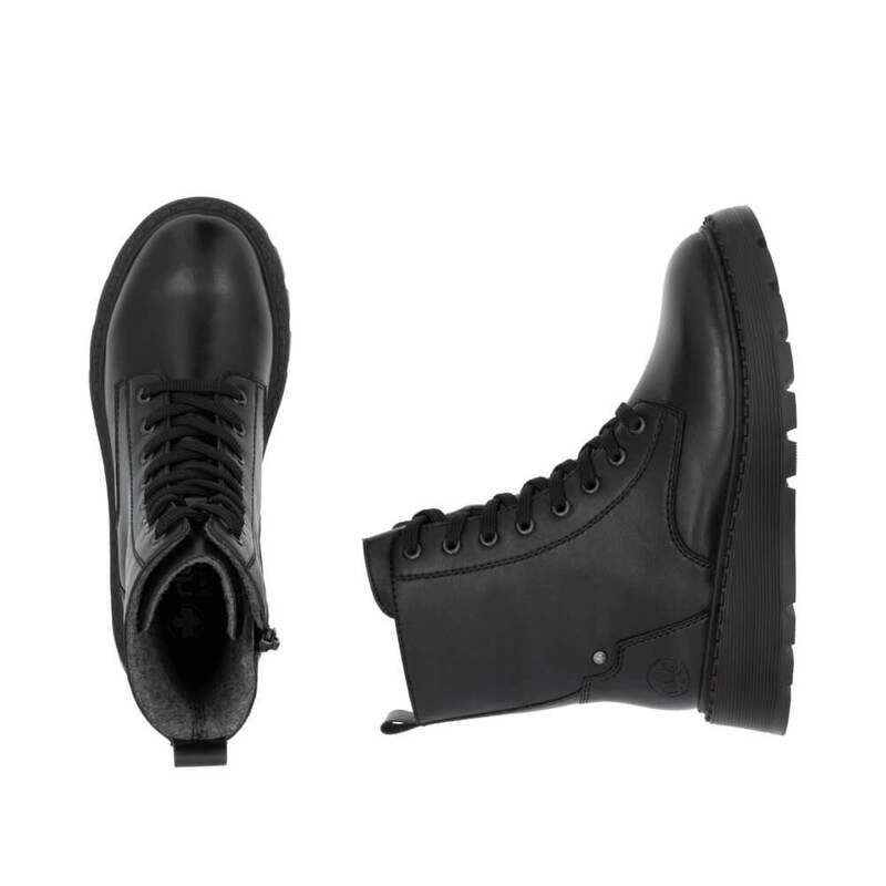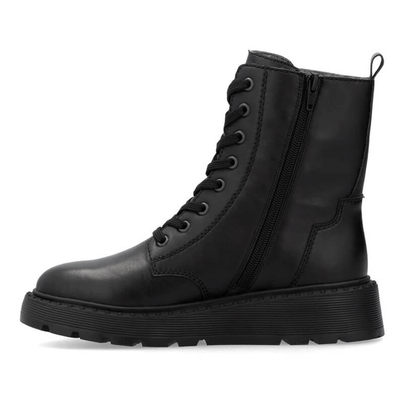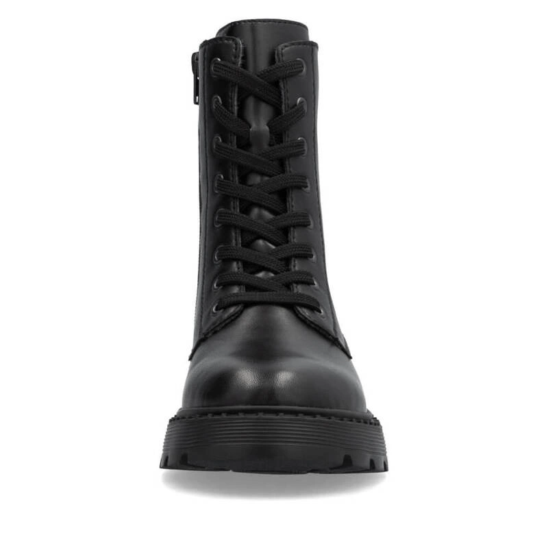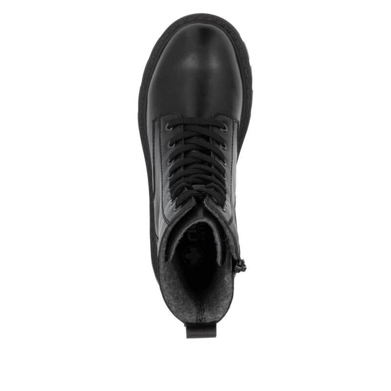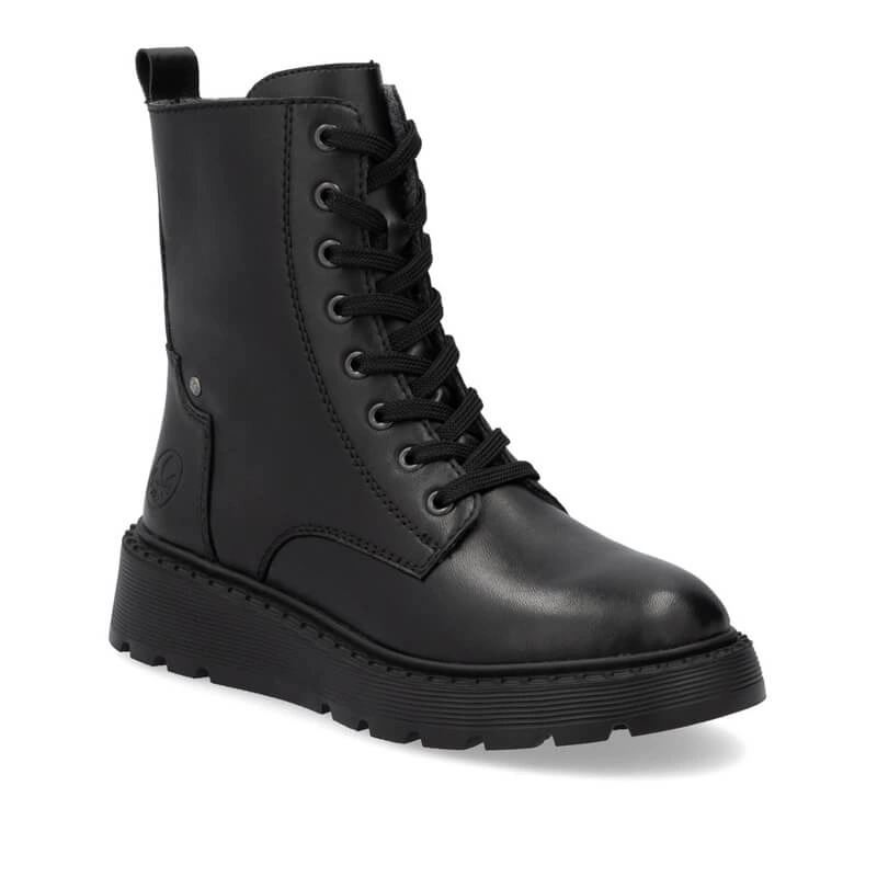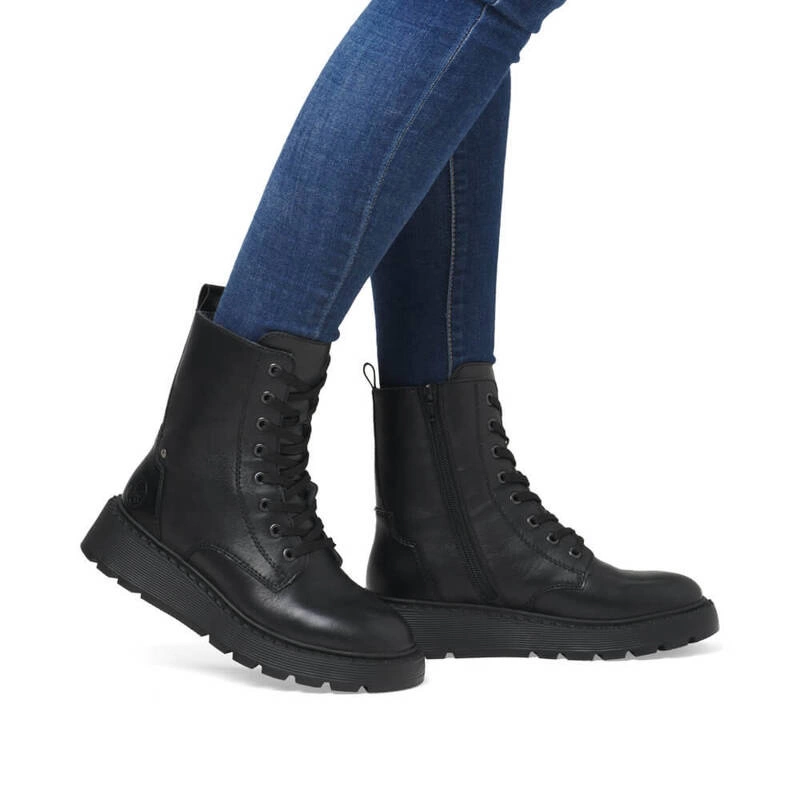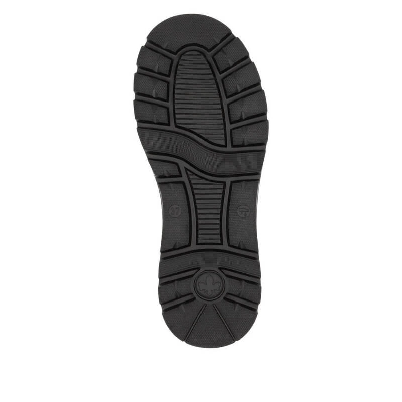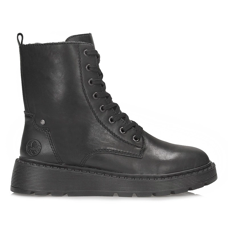 Znana i lubiana marka Rieker przedstawia botka w odcieniu czerni. Cholewka powyższego modelu została wykonana ze skóry ekologicznej w połączeniu z naturalną. Obuwie wyposażone w tradycyjne sznurowanie na 8 dziurek, co pozwala na swobodne dopasowanie obuwia do różnej tęgości stopy. Dodatkowym atutem botka jest zamek umieszczony po wewnętrznej stronie, który ułatwi zakładanie oraz ściąganie obuwia. Wnętrzne zostało wyściełane z miłego w dotyku filcu, który zapewni ciepło podczas chłodnych dni. Trwała, grubsza podeszwa wykonana z wysokogatunkowego tworzywa sztucznego. Fason dzięki swojemu klasycznemu kolorowi dopasujemy do wielu stylizacji.