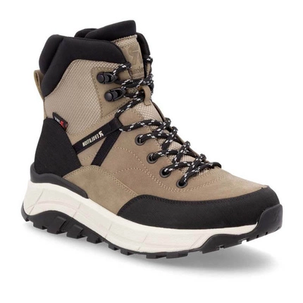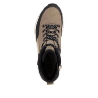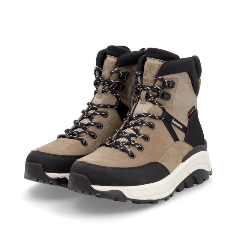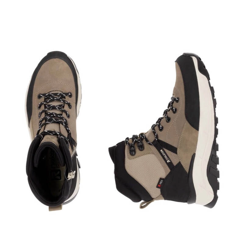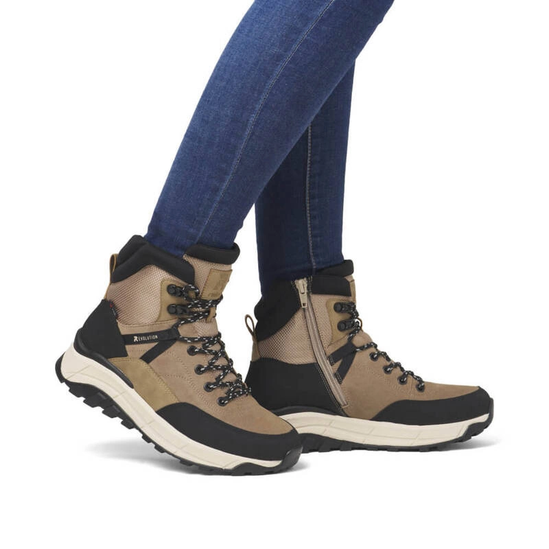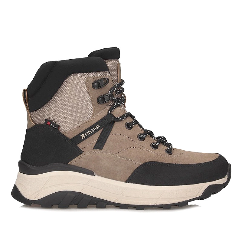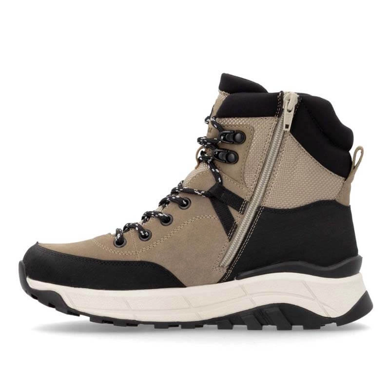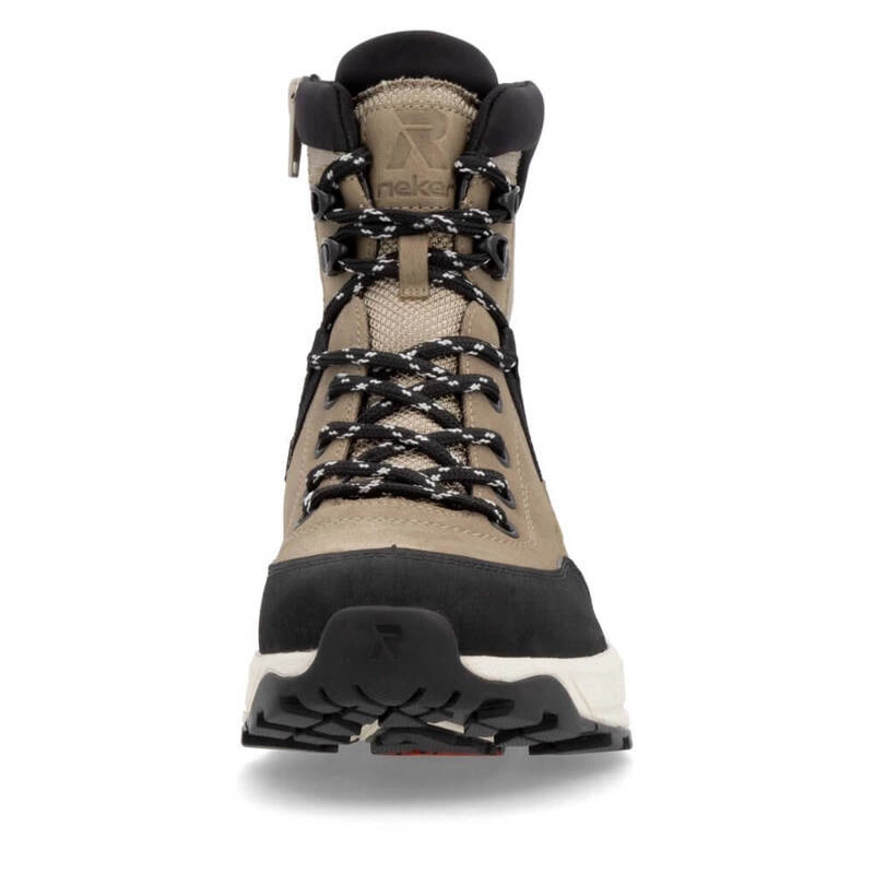 Botki damskie znanej i lubianej niemieckiej marki Rieker pochodzące z najnowszej kolekcji jesień-zima. Cholewka obuwia wykonana ze skóry naturalnej w połączeniu z wysokogatunkową tkaniną w czarno-bezowym odcieniu. Nosek zaokrąglony, lekko uniesiony ku górze pozwoli nam na swobodne rozłożenie palców. Wnętrze jak i wkładka wykonane z miękkiej naturalnej owczej wełny która zapewni ciepło w chłodne dni. Obuwie wyposażone w tradycyjne sznurowanie na 7 dziurek, co pozwala na swobodne dopasowanie obuwia do różnej tęgości stopy. Fason po wewnętrznej stronie posiada praktyczny zamek, który ułatwi zakładanie jak i ściąganie obuwia. Trwała, grubsza podeszwa wykonana z wysokogatunkowego tworzywa sztucznego. Model z pewnością przypadnie do gustów wielu Pań. Podeszwa antypoślizgowa z domieszką włókna szklanego.
