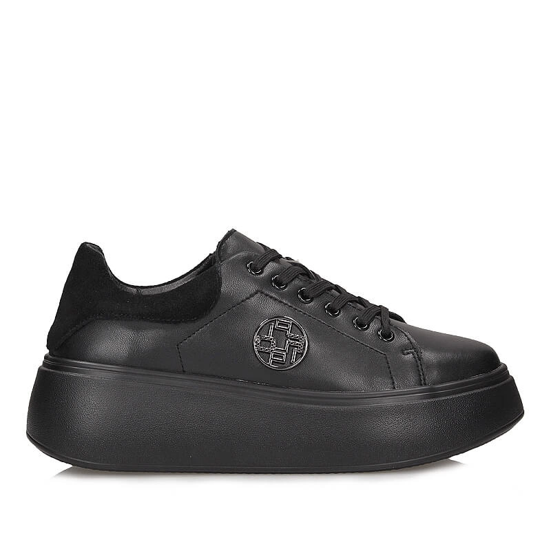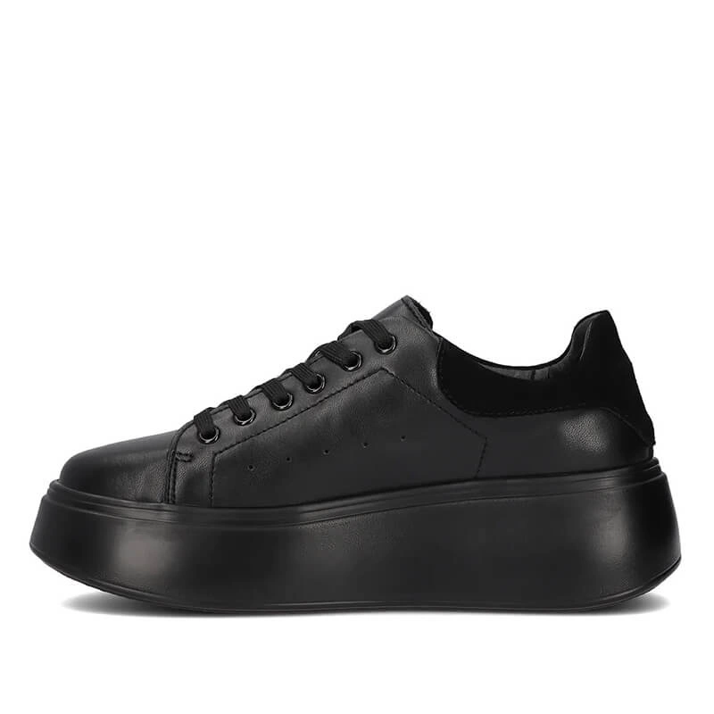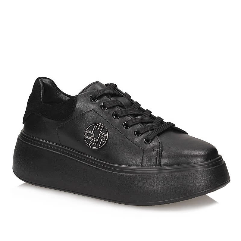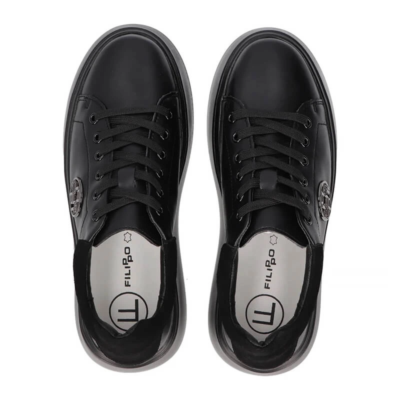 Czarne sneakersy Filiipo to gwarancja wygody oraz komfortu nawet podczas całodziennego użytkowania. Cholewka obuwia została wykonana ze skóry naturalnej licowej. Miękka i delikatna wkładka powstała ze skóry naturalnej i odpowiada za odpowiedni komfort obuwia jak i przepuszczalność powietrza. Sznurowanie umożliwi odpowiednie dopasowanie obuwia do tęgości stóp. Nosek delikatnie zaokrąglony i podniesiony lekko ku górze. Wysoka oraz gruba podeszwa 5 cm to hit sezonu oraz wygoda podczas przemierzania codziennych tras, wykonana z trwałego tworzyw sztucznego.