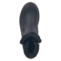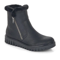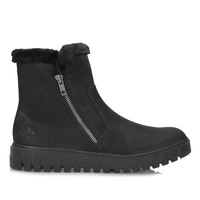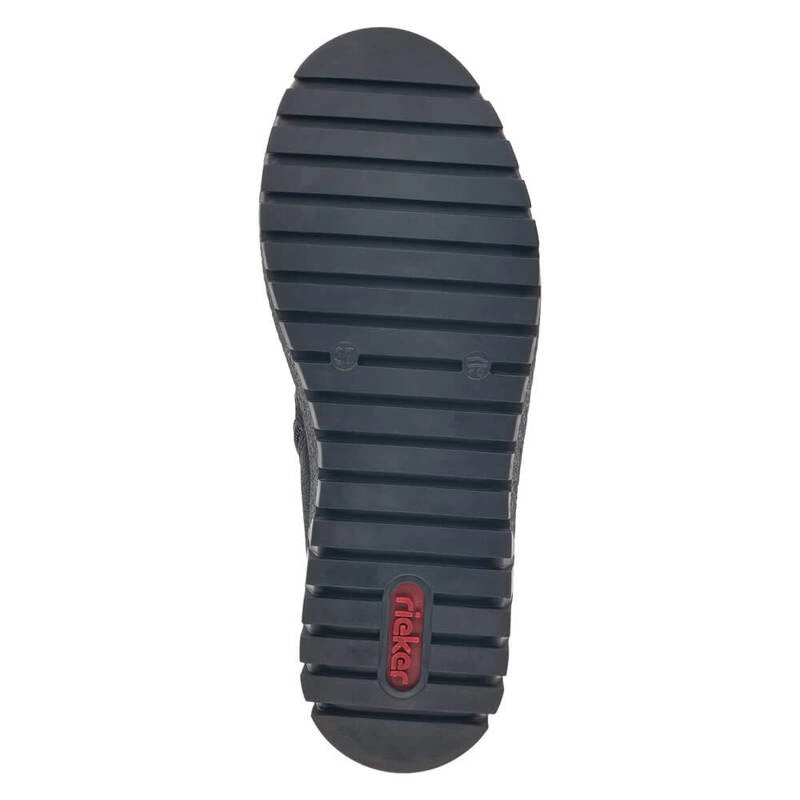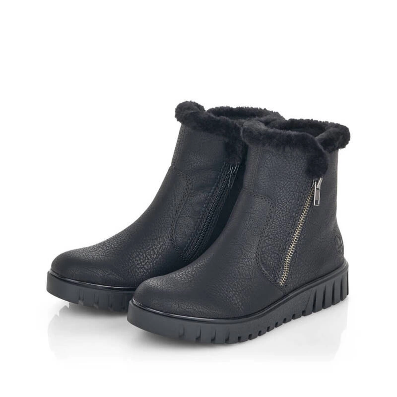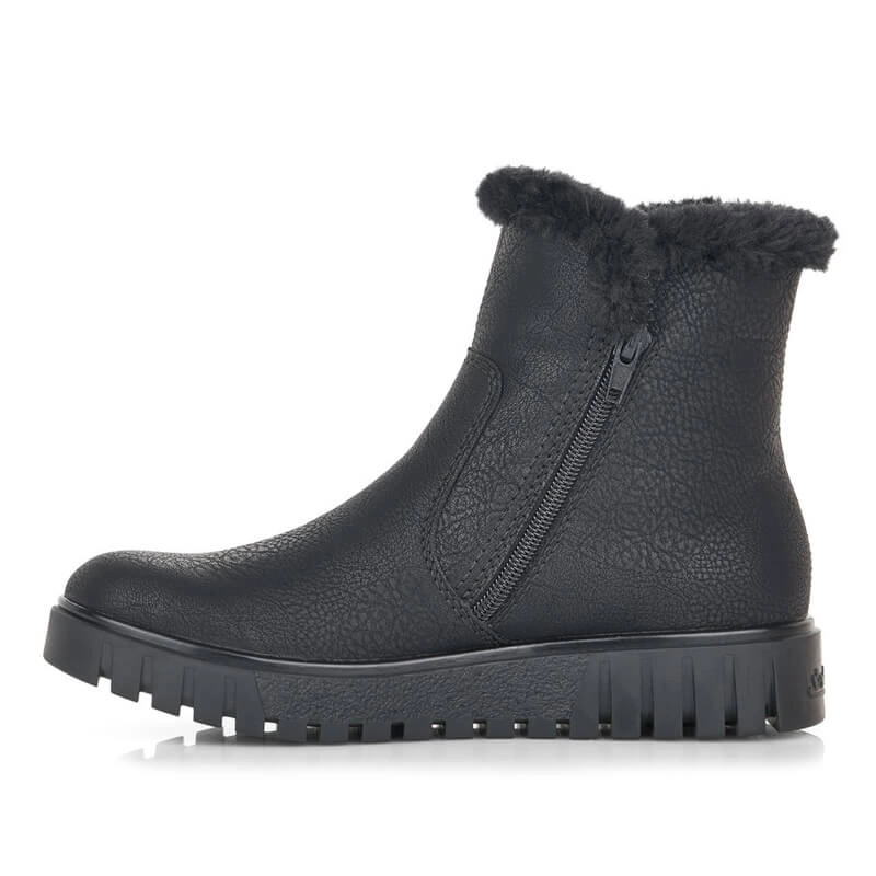 Najnowsza propozycja damskich botków zimowych marki Rieker. Cholewka wykonana została z wysokiej jakości skóry ekologicznej w klasycznym czarnym kolorze. Środek wyściełany ciemną ociepliną, która zapewni ciepło w chłodniejsze dni. Grubsza podeszwa wykonana z wysokogatunkowego tworzywa odpornego na ścieranie. Model za kostkę. Zamek znajdujący się z boku cholewki zapewni szybsze założenie oraz ściągnięcie obuwia. Okrągły nosek pozwoli na swobodne rozłożenie palców wewnątrz obuwia. Przeszycia na cholewce dodają obuwiu nietuzinkowego wyglądu. Idealnie sprawdzą się w codziennym użytkowaniu.