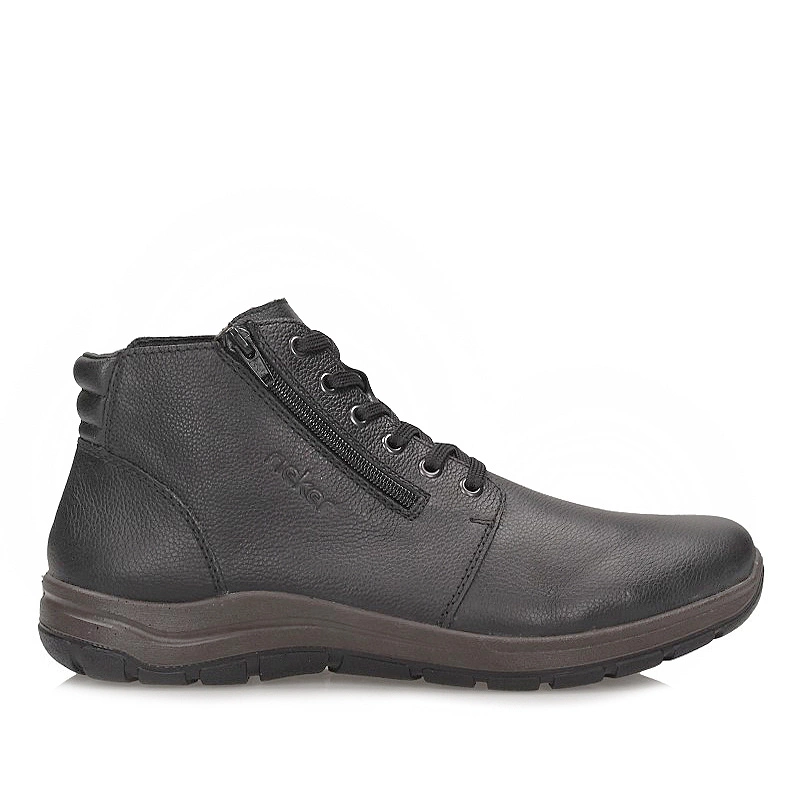 Botki męskie znanej i lubianej niemieckiej marki Rieker pochodzące z najnowszej kolekcji jesień-zima. Materiał zewnętrzny wykonany ze skóry naturalnej licowej w czarnym odcieniu.