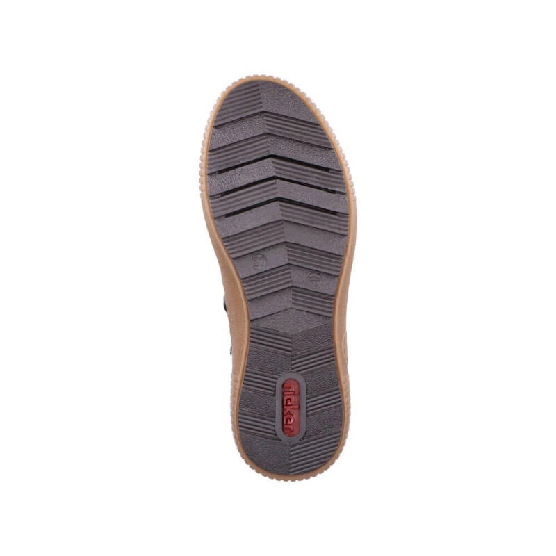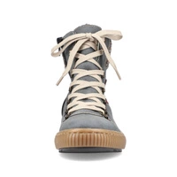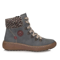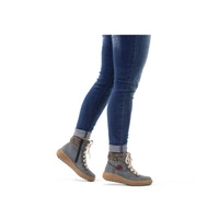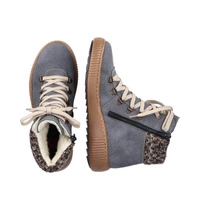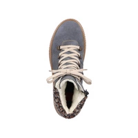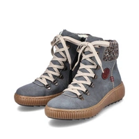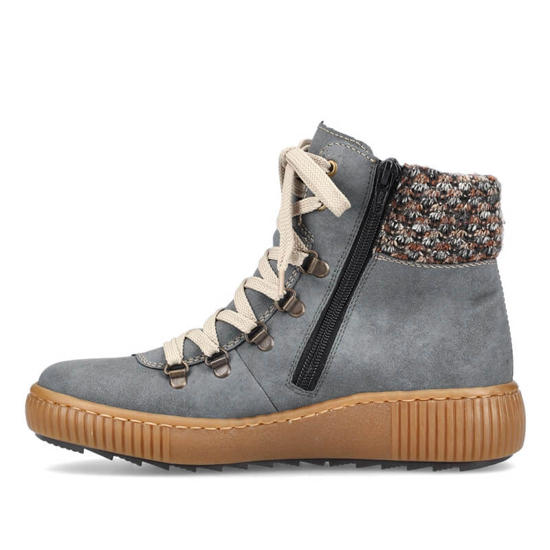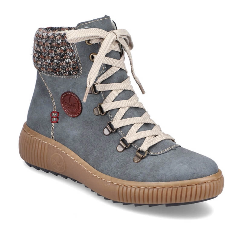 Niemiecka marka Rieker przedstawia najnowszy model botków damskich z kolekcji jesienno-zimowej. Model w odcieniu niebieskim wykonany z najwyższej jakości skóry ekologicznej nubukowej. Wnętrze wyściełane zostało przyjemną ociepliną, która zapewni ciepło w chłodne dni. Po wewnętrznej stronie umieszczono zamek, za pomocą którego możemy szybciej założyć, jak i ściągnąć obuwie. Nosek zaokrąglony, lekko uniesiony ku górze pozwoli swobodnie rozłożyć palce. Model sznurowany na 7 dziurek, pozwoli nam na dopasowanie obuwia do różnej tęgości kobiecej stopy. Umieszczone logo firmy oraz kolorowa ocieplina dodają obuwiu nietuzinkowego wyglądu. Ciekawy model uzupełni wiele zimowych stylizacji.