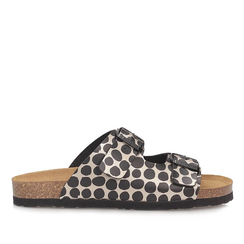 Oryginalny model klapek przedstawia niemiecka marka Dr. Brinkmann. Prezentowany model wykonany został z wysokiej jakości skóry ekologicznej licowej, którą zdobi motyw w kropki. Umieszczone paski na cholewce umożliwiają nam na wyregulowanie klapek do każdego rodzaju tęgości stopy. Wkładka wykonana ze skóry naturalnej welurowej otula delikatnie stopę i gwarantować będzie odpowiedni mikroklimat dla stóp. Zastosowanie w wkładce półwałka pod palcowego umożliwia optymalne prowadzenie palców tak, aby zachować naturalne ruchy stopy. W wkładce znajduję się również miejsce, które ma wspomagać podparcie łuku poprzecznego stopy i wpływać na naturalną oraz prawidłową pozycję ciała podczas stania. Zagłębienie pięty w tylnej części obuwia wspomaga naturalną postawę oraz równowagę całego naszego ciała. Do wyprodukowania wyściółki podeszwy użyto materiału korkowo-lateksowego co sprawia, że prezentowany model klapek jest bardzo lekki, elastyczny oraz komfortowy.