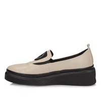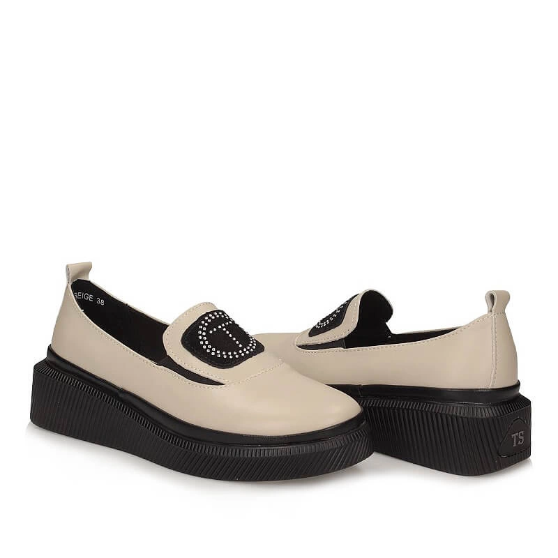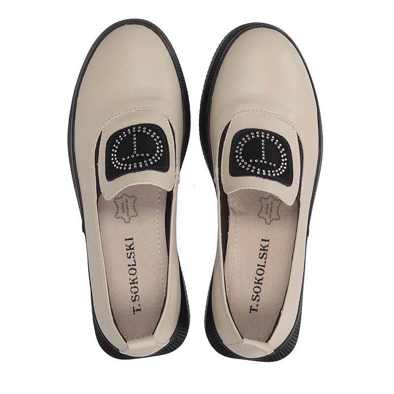 Półbuty marki T.Sokolski pochodzące z najnowszej kolekcji. Cholewka obuwia została wykonana z wysokiej jakości skóry naturalnej licowej w kolorze beżowym. Nosek obuwia lekko zaokrąglony uniesiony ku górze pozwalający swobodnie rozłożyć palce. Wkładka została wykonana ze skóry naturalnej odpowiadającą za wygodę naszych stóp. Fason wsuwany co pozwala na jego szybkie i bezproblemowe zakładanie. Model został ozdobiony logiem firmy. Całość została osadzona na 5 centymetrowej platformie. Dzięki swojemu klasycznemu kolorowi idealnie dopasuje się do wielu stylizacji.