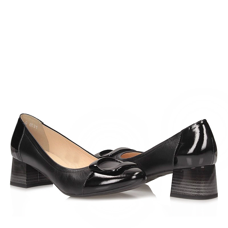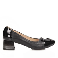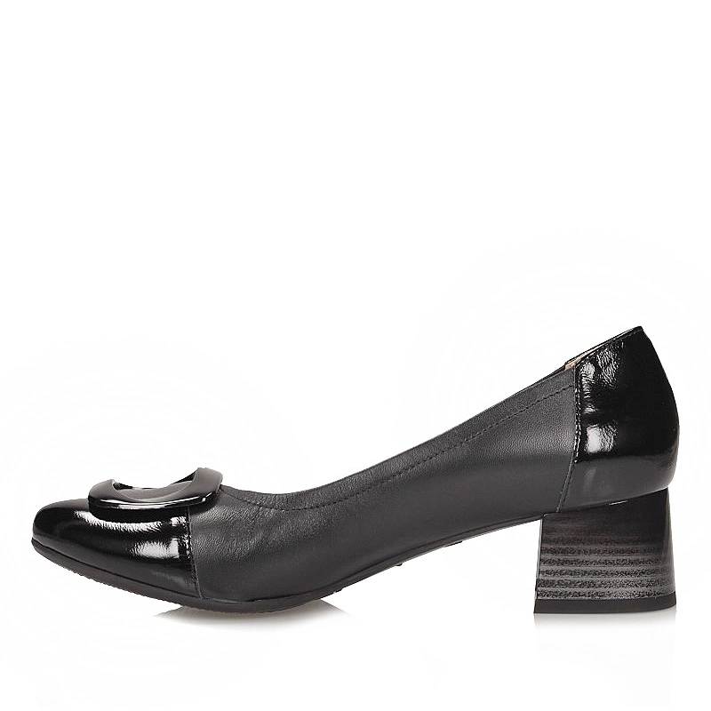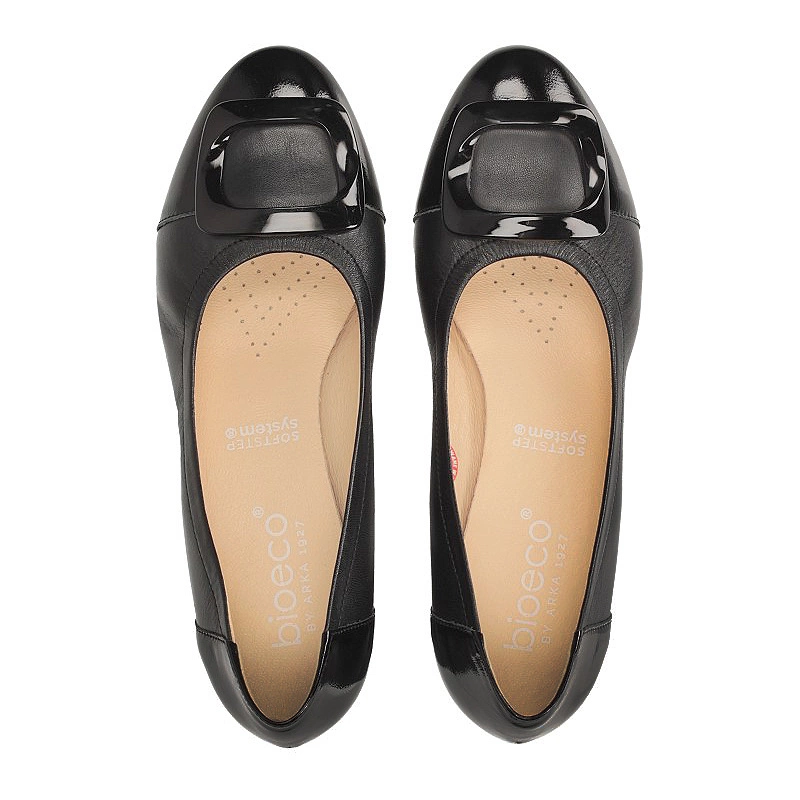 Czółenka marki Bioeco by Arka pochodzące z najnowszej kolekcji. Cholewka została wykonana z wysokiej jakości skóry naturalnej licowej w kolorze czarnym. Nosek obuwia wąski lekko uniesiony ku górze. Wkładka została wykonana ze skóry naturalnej świetnie dopasuje się do stóp. Model wsuwany co pozwala na jego szybkie i bezproblemowe zakładanie. Z przodu na cholewce obuwie zostały ozdobione oryginalną ozdoba w kształcie prostokąta. Szeroki 5 centymetrowy obcas zapewni wygodę w czasie noszenia. Obuwie dzięki swojemu klasycznemu kolorowi idealnie sprawdzą się na różne okazje.