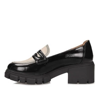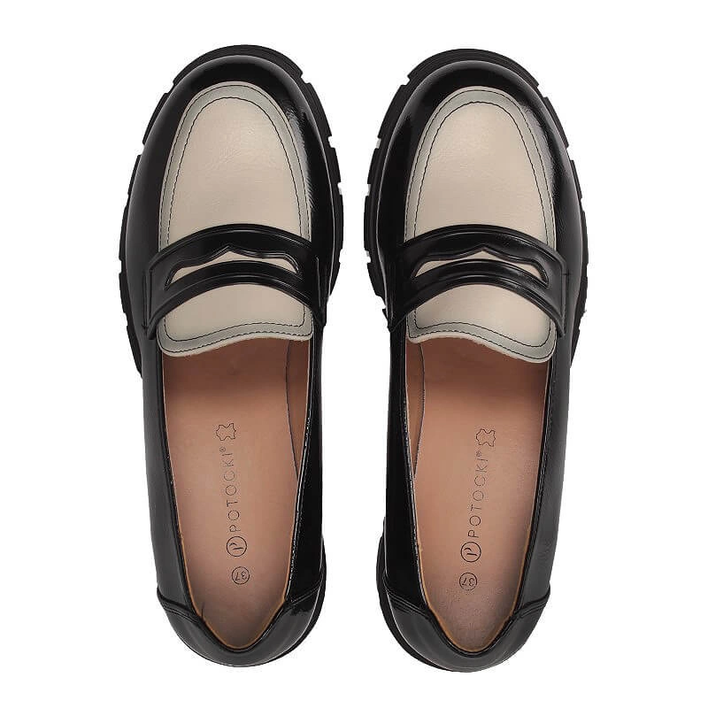 Mokasyny damskie marki Potocki pochodzące z najnowszej kolekcji. Obuwie wykonane ze skóry ekologicznej lakierowanej w kolorze czarno-beżowym. Nosek wpadający w migdał, lekko uniesiony ku górze. Przód stylizowany na fason mokasyna z grubym przeszyciem, co nadaje mu wyjątkowego wyglądu. Model jest wsuwany na stopę, co umożliwia szybkie zakładanie i zdejmowanie.  Szeroki i stabilny korek o wysokości 6 cm. Wkładka wykonana z naturalnej skóry w ciemniejszym kolorze. Podeszwa, wysokogatunkowa, odporna na ścieranie.