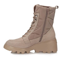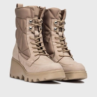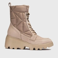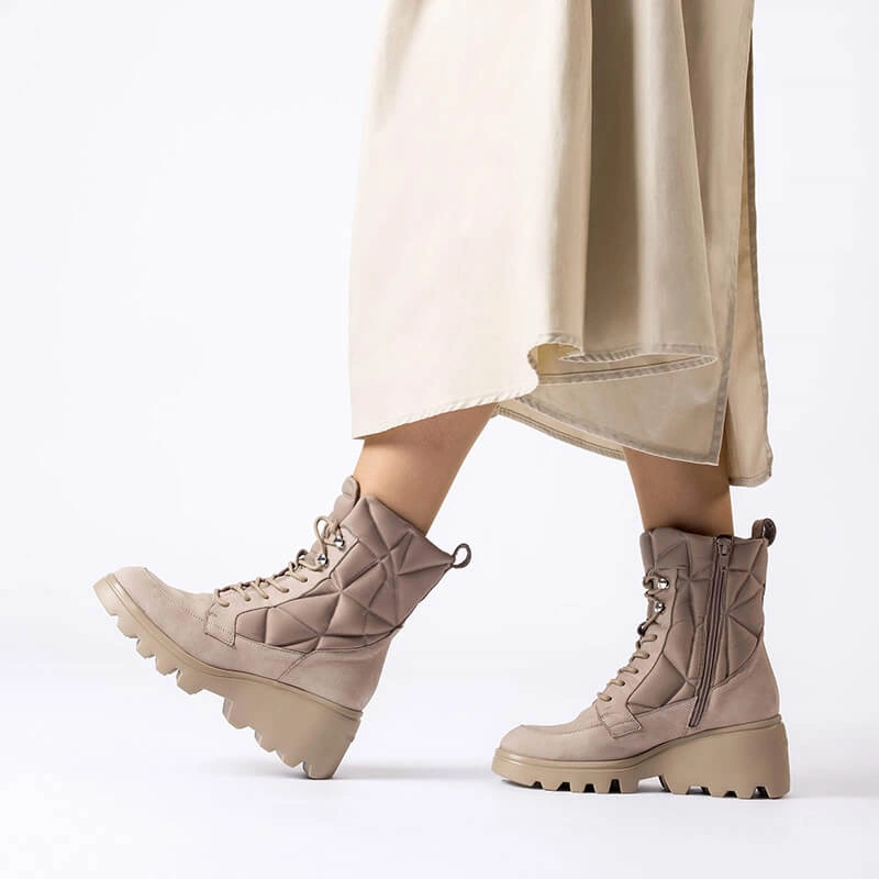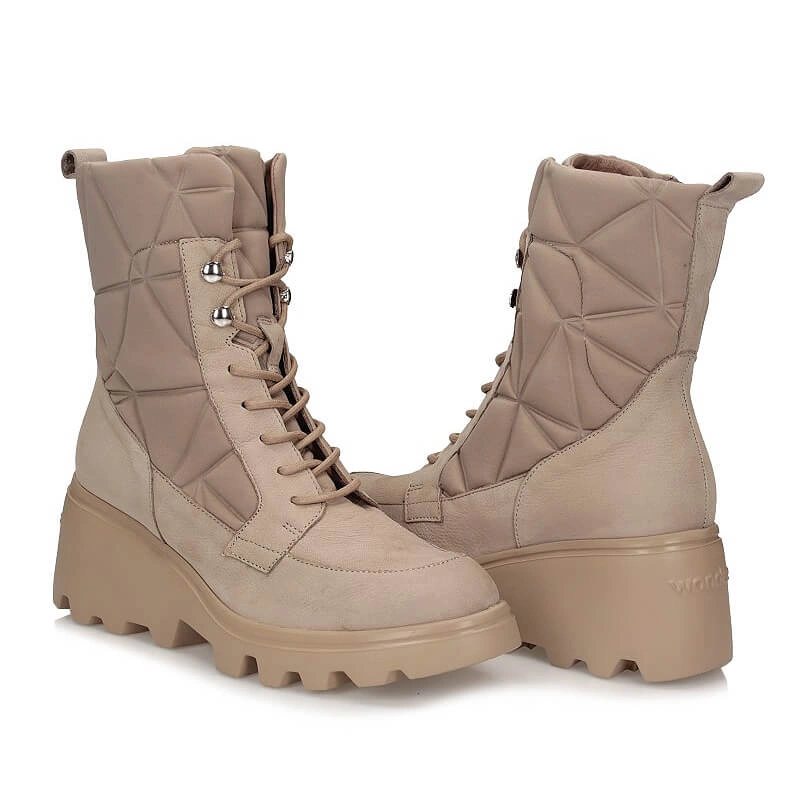 Botki znanej hiszpańskiej marki Wonders pochodzące z najnowszej kolekcji. Cholewka obuwia została wykonana ze skóry naturalnej w oryginalnym kolorze beżowym. Nosek obuwia w kształcie migdała uniesiony lekko ku górze co spowoduje na swobodne rozłożenie palcy. Wnętrze obuwia wykonane ze skóry naturalnej nubukowej. Model ten jest sznurowany na 7 dziurek, natomiast producent dołączył po boku zamek co ułatwi nam go ubranie czy ściągnięcie. Całość obuwia została osadzona na 6 cm słupku. Model ten przypasuje wielu klientkom oraz dopełni nasze stylizacje.