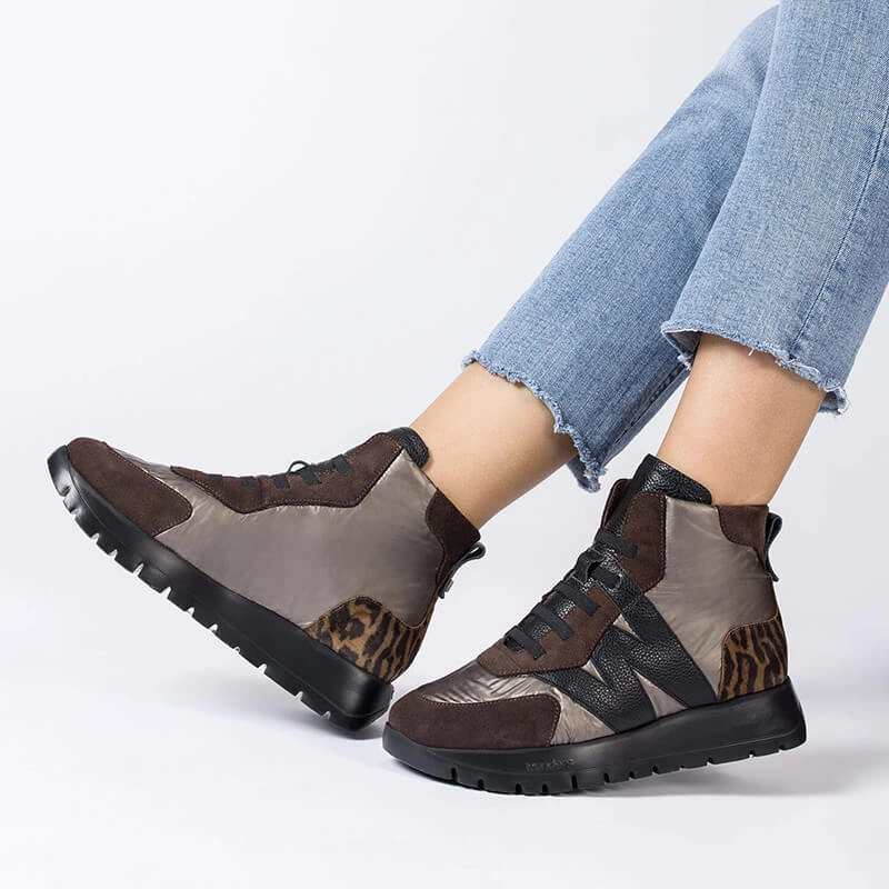 Oryginalny model botków przedstawia hiszpańska marka Wonders. Cholewka prezentowanego modelu została wykonana ze skóry naturalnej zamszowej oraz wysokogatunkowego materiału. Połączenie w obuwiu kilku materiałów o różnych gramaturach, sprawia, że jest to model nietuzinkowy, który swoją oryginalnością nada jesiennym stylizacją niezwykle stylowego wyglądu. Miękka wkładka wykonana została ze skóry naturalnej. Model wsuwany, wyposażony w gumeczki na języku, które pomagać mają wygodnie zakładać obuwie. Nosek zaokrąglony, lekko podniesiony ku górze. Podeszwa o wysokości 4 cm wykonana z trwałego, wysokogatunkowego tworzywa.