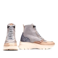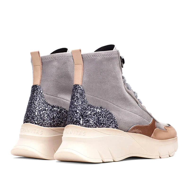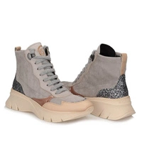 Botki znanej hiszpańskiej marki Hispanitas pochodzące z najnowszej kolekcji. Model został wykonany ze skóry naturalnej licowej, w odcieniu szarości, łączonego z srebrnym brokatem. Nosek obuwia zaokrąglony lekko uniesiony lekko ku górze pozwalający swobodnie rozłożyć palce. Wkładka wykonana z tworzywa sztucznego. Obuwie sznurowane na 8 dziurek, pozwalające na jego szybkie zakładanie. Podeszwa wykonana z tworzywa z właściwościami antypoślizgowymi.  Obuwie dzięki swojemu klasycznemu kolorowi dopasujemy do wielu szalonych stylizacji.