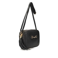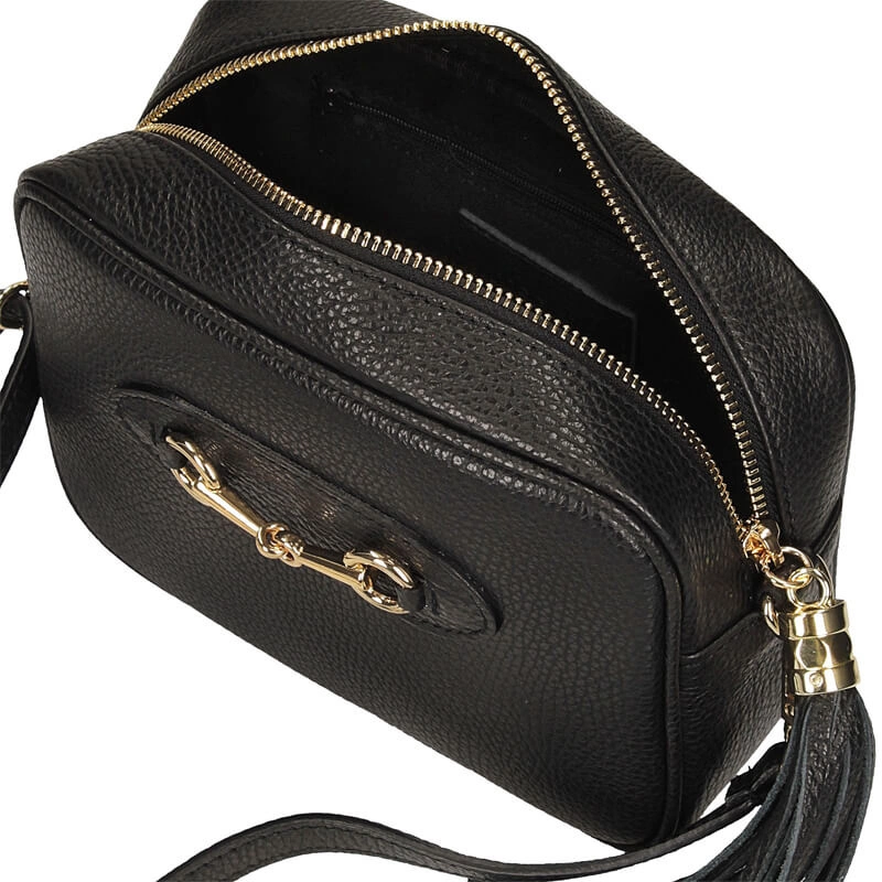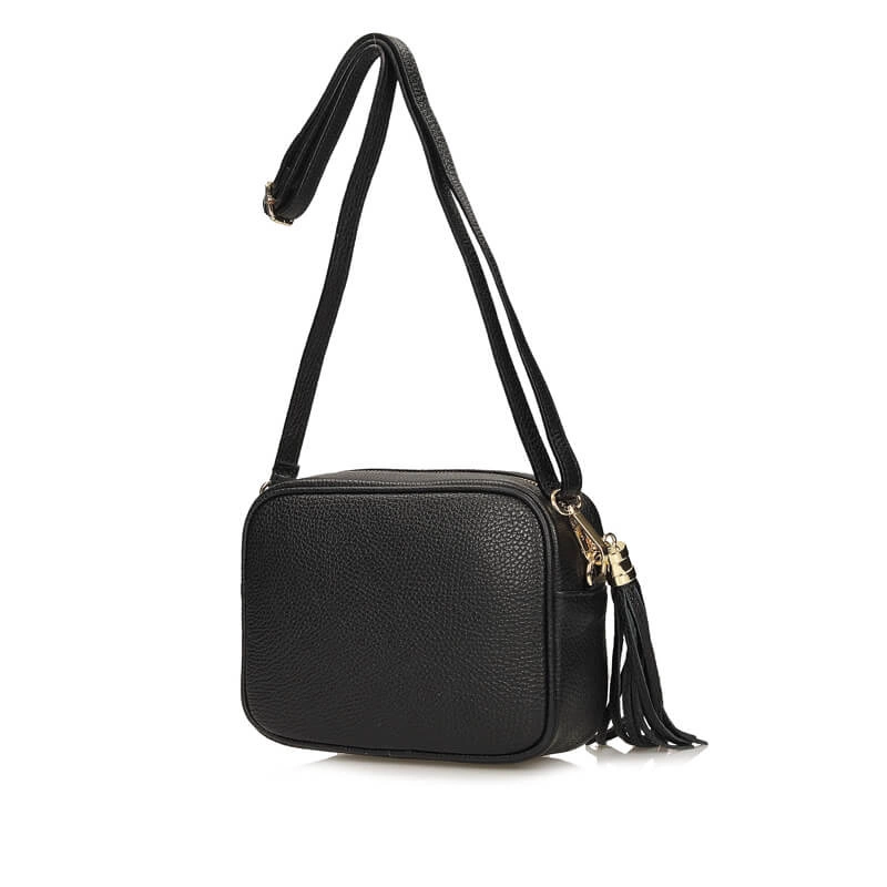 Zgrabna listonoszka w odcieniu klasycznej czerni to projekt z nowej kolekcji jesienno-zimowej włoskiej marki Toscanio. Wykonana ze skóry naturalnej licowej. Model jednokomorowy, zapinany na zamek. Pasek torebki posiada możliwość regulacji. Całość torebki świetnie dopełnia frędzel oraz złote elementy. Wewnątrz umieszczono małą kieszonkę zapinaną na zamek