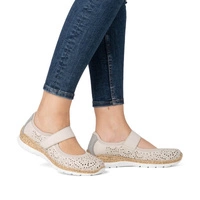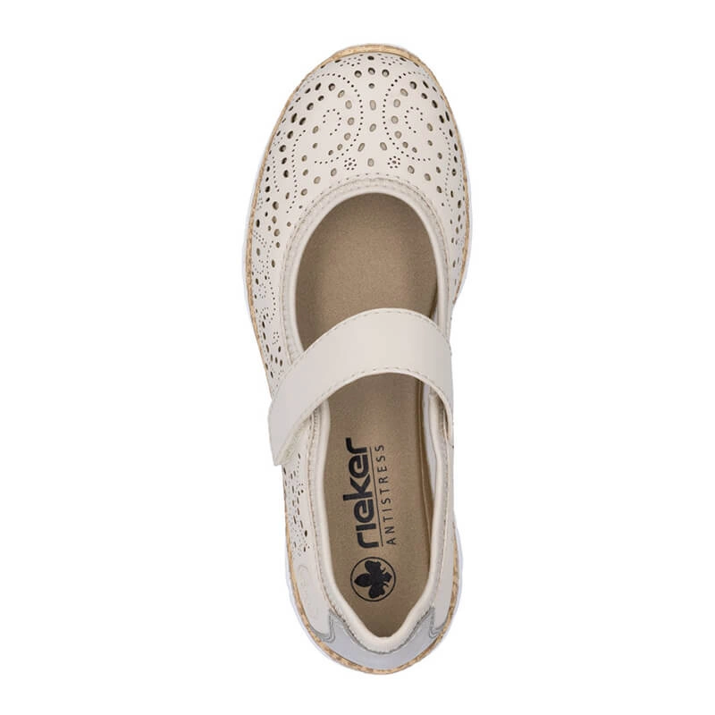 Wsuwane półbuty znanej i lubianej marki Rieker pochodzące z najnowszej kolekcji. Model ten został wykonany ze skóry ekologicznej i ozdobiono go delikatnymi ażurowymi wycięciami. Zapięcie na rzep pozwala nam wygodnie oraz komfortowo zakładać jak i zdejmować obuwie. Miękka wkładka została wykonana z delikatnej tkaniny i świetnie sprawdzi się w codziennym użytkowaniu dopasowując się do kształtu naszych stóp. Nosek obuwia lekko zaokrąglono i podniesiono ku górze. Podeszwa wykonana została z trwałego tworzywa sztucznego.