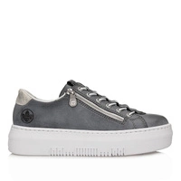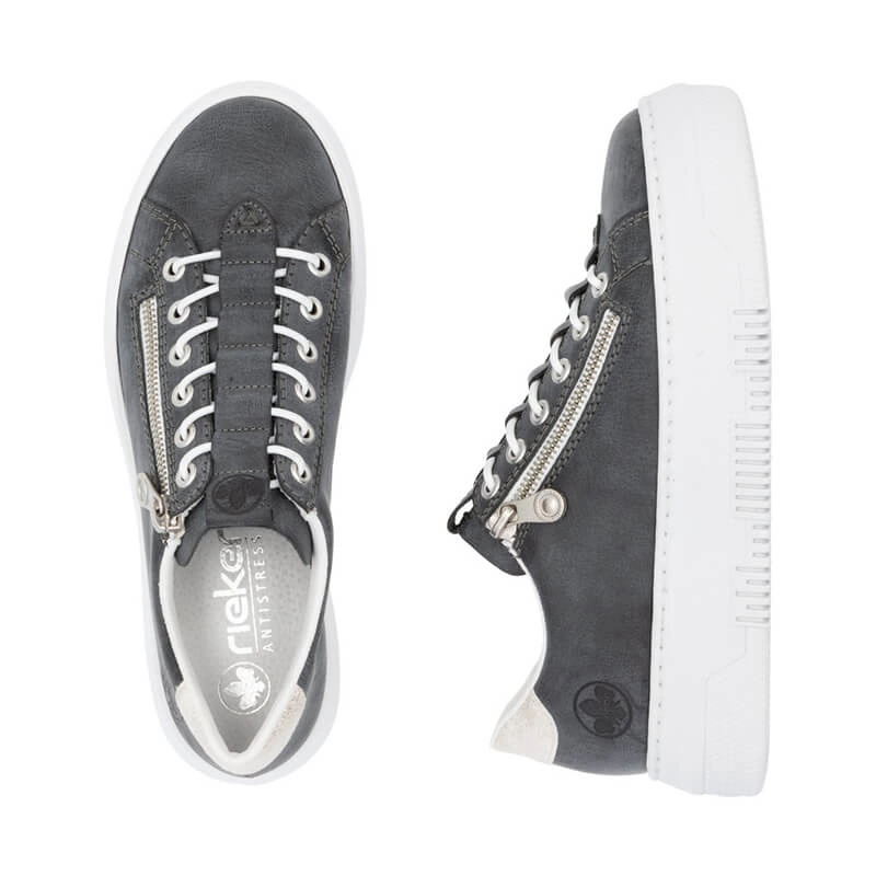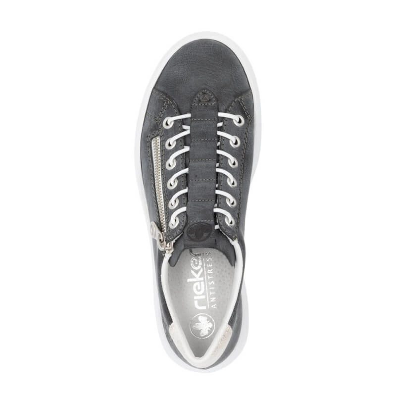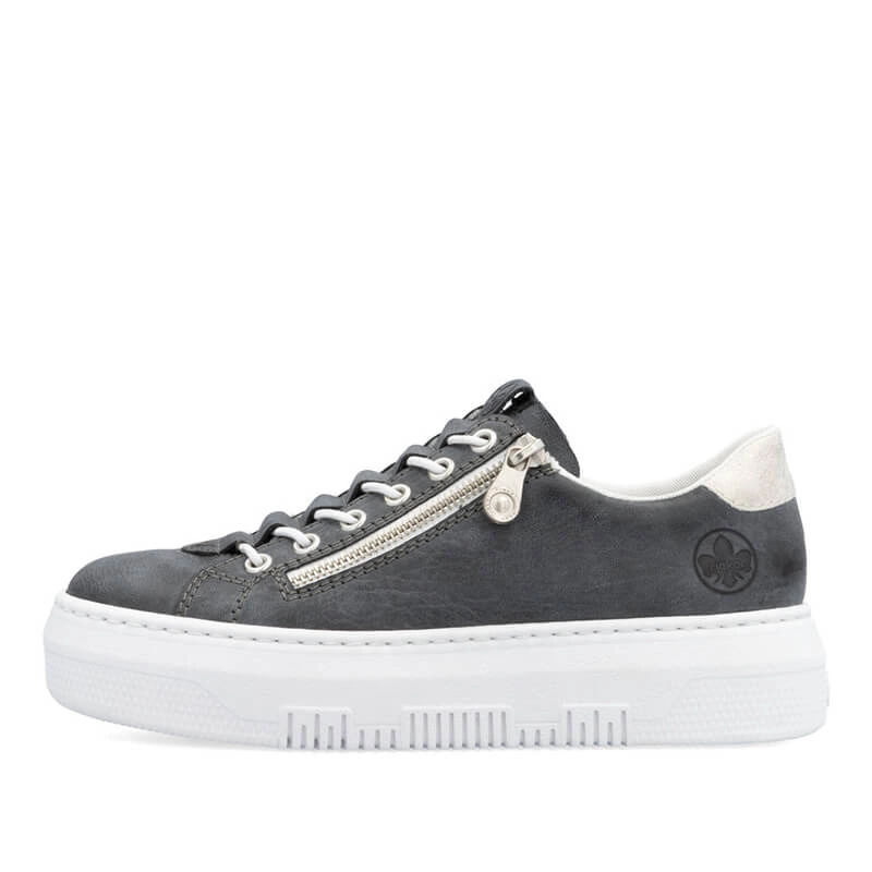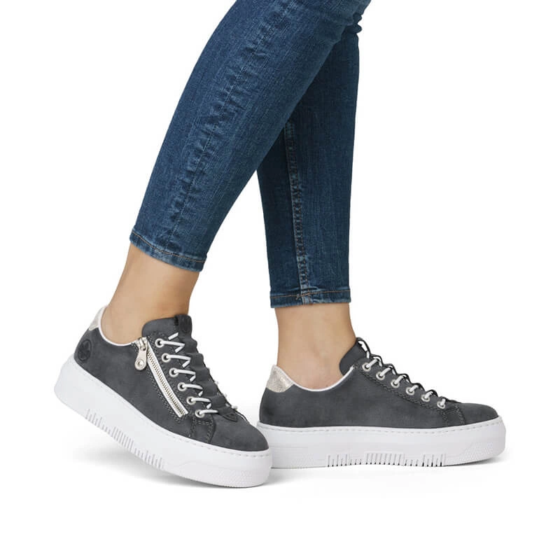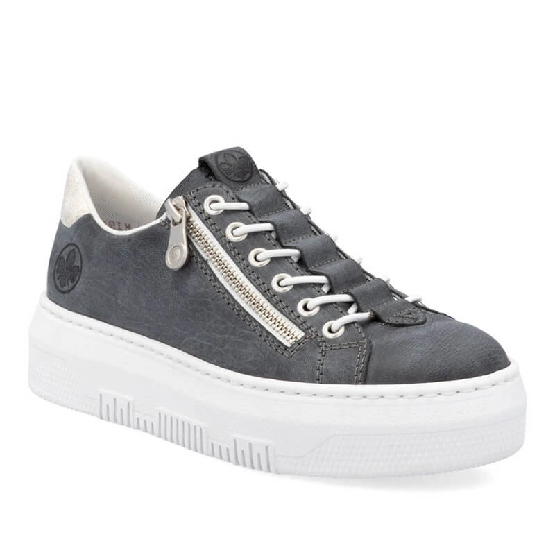 Sneakersy znanej marki Rieker pochodzące z najnowszej kolekcji. Model został wykonany z wysokiej jakości skóry ekologicznej w odcieniu jasnego błękitu. Nosek zaokrąglony, pozwalający swobodnie rozłożyć palce. Wnętrze wyściełane zostało materiałem, a wkładka przyjazną dla stóp skórą naturalną. Fason wiązany na 6 dziurek, po boku również zamek który ułatwi zakładanie i ściąganie obuwia. Podeszwa o wysokości 4 cm , wykonana z wysokogatunkowego tworzywa sztucznego. Obuwie zapewni nam komfort i wygodę, świetnie dopasuje się do wielu stylizacji.