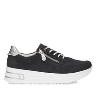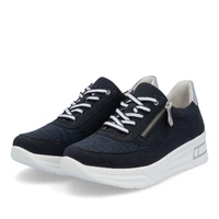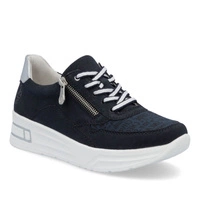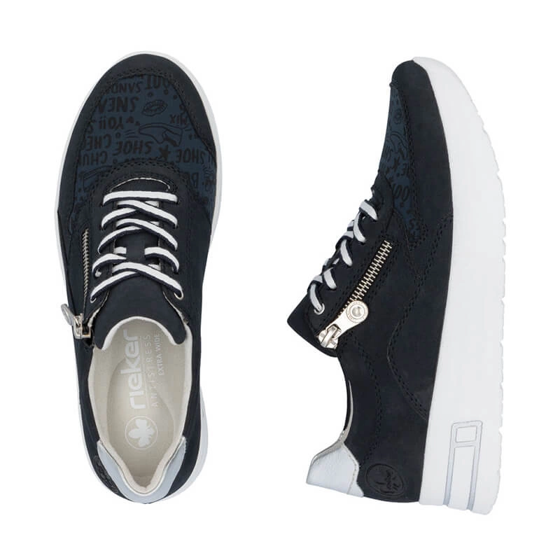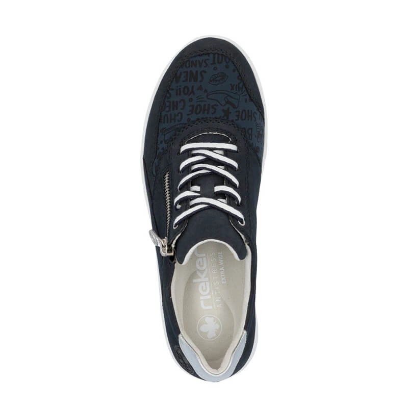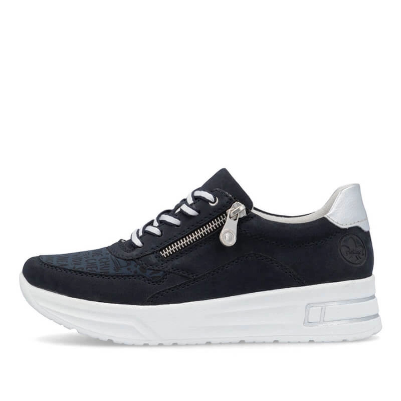 Modne sneakersy damskie znanej marki Rieker pochodzące z najnowszej kolekcji. Materiał zewnętrzny obuwia wykonany z wysokiej jakości tkaniny w odcieniu niebieskim. Nosek zaokrąglony, pozwalający swobodnie rozłożyć palce. Wnętrze jak i wkładka zostały wyściełane przyjazną dla stóp tkaniną. Fason wiązany na 5 dziurek, po boku również zamek który ułatwi zakładanie i ściąganie obuwia. Podeszwa o wysokości 4 cm , wykonana z wysokogatunkowego tworzywa sztucznego. Obuwie zapewni nam komfort i wygodę, świetnie dopasuje się do wielu stylizacji.