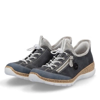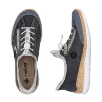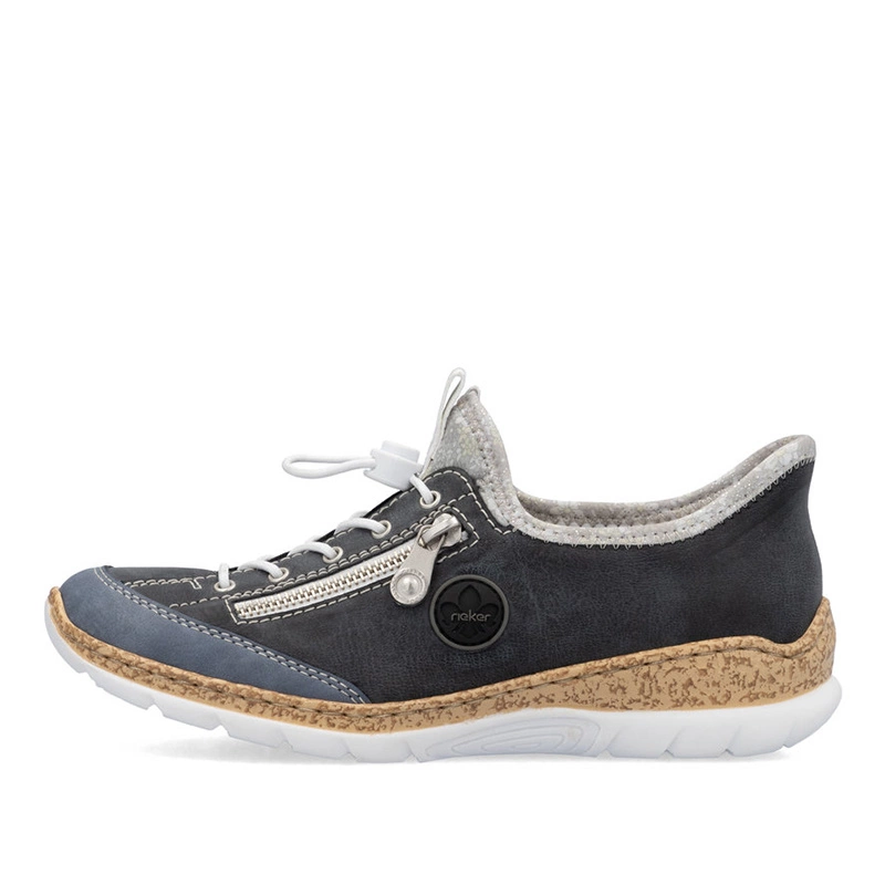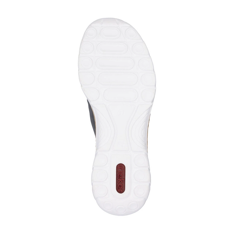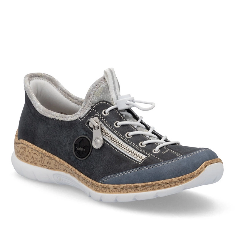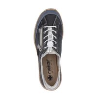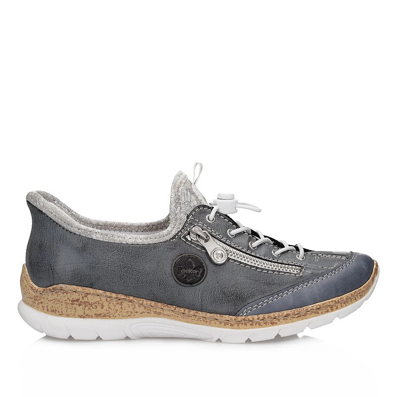 Modne półbuty znanej marki Rieker pochodzące z najnowszej kolekcji. Cholewka obuwia została wykonana z wysokiej jakości skóry ekologicznej licowej w niebieskim odcieniu. Nosek okrągły, lekko uniesiony ku górze pozwoli na swobodne rozłożenie palców. Wkładka wykonana z miękkiej tkaniny, która umożliwia przepuszczalność powietrza. Całość oparta na 3 centymetrowej platformie. Klasyczne wiązanie gwarantuje swobodne dopasowanie obuwia do różnej tęgości kobiecej stopy. Model półbutów który idealnie sprawdzi się w wiosenno-letnich stylizacjach.