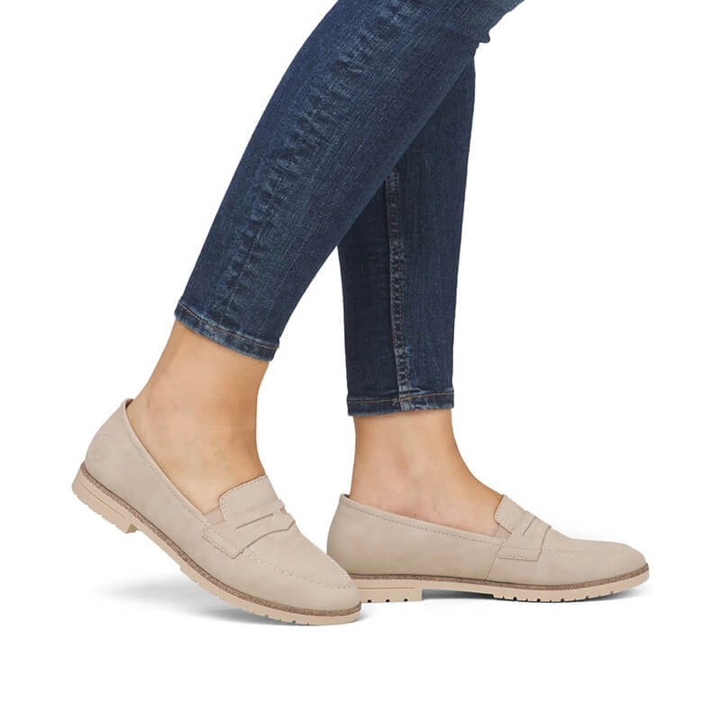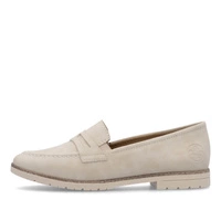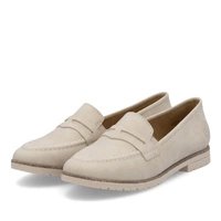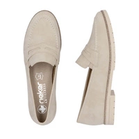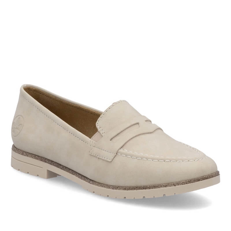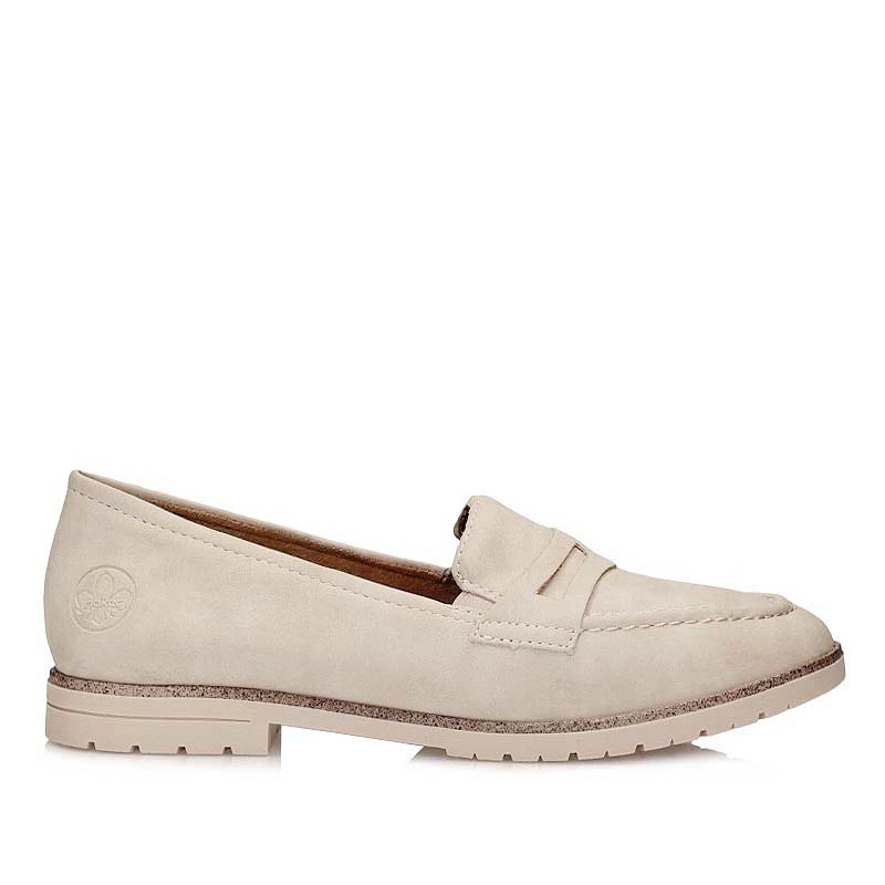 Beżowe półbuty mokasyny damskie znanej marki Rieker pochodzące z najnowszej kolekcji. Materiał zewnętrzny wykonany z naturalnej skóry nubukowej w połączeniu ze skórą ekologiczną w beżowym kolorze. Nosek okrągły, zapewni swobodne rozłożenie palców. Przód zdobiony grubym, charakterystycznym dla mokasyna szyciem. Prezentowany model idealnie sprawdzi się do wielogodzinnego użytkowania bez poczucia obciążenia stopy. Obcas szerszy, stabilny o wysokości 2,5 cm. Wkładka z naturalnej skóry ekologicznej. Idealny model dla różnorodnych stylizacji.