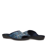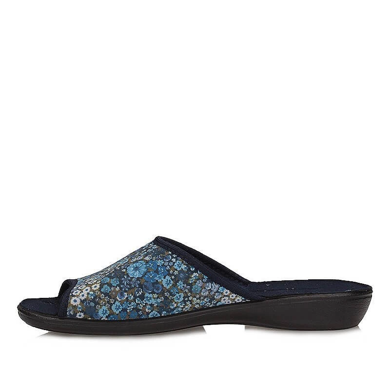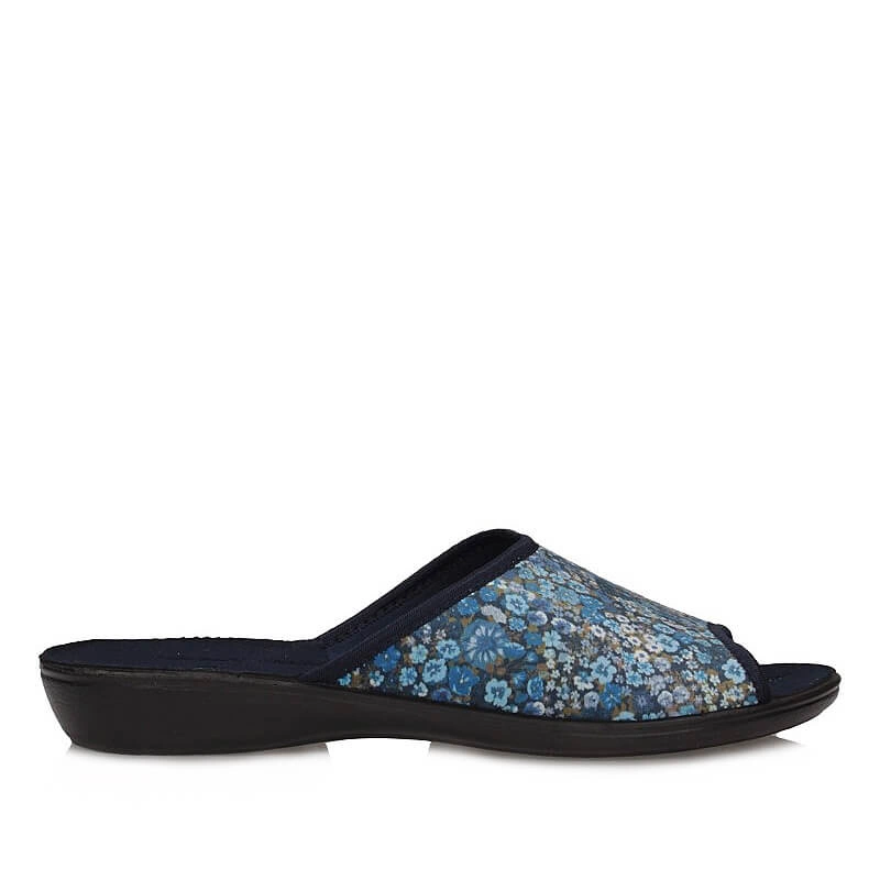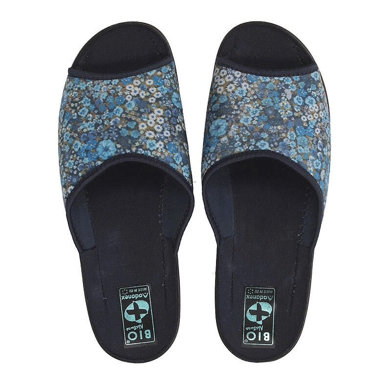 Wygodne laczki kapcie znanej i szanowanej marki Adanex pochodzące z najnowszej kolekcji. Materiał zewnętrzny wykonany z wysokogatunkowej tkaniny w granatowym odcieniu. Nosek odkryty, pozwalający swobodnie rozłożyć palce. Wkładka wykonana z tkaniny odpowiadająca za wygodne naszych stóp. Całość osadzona na 2 centymetrowej podeszwie wykonanej z tworzywa sztucznego. Laczki ozdobione zostały modnym w tym sezonie kwiatowym motywem.
