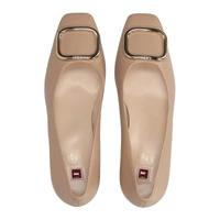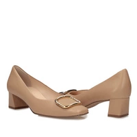 Metalowa ozdobna sprzączka w złotym odcieniu dodaje subtelnego szyku, idealnego na firmowe bankiety i uroczyste kolacje; beżowa, neutralna paleta kolorów ułatwia łączenie butów z garsonką, ołówkową spódnicą lub eleganckimi dżinsami na nieformalne spotkania.