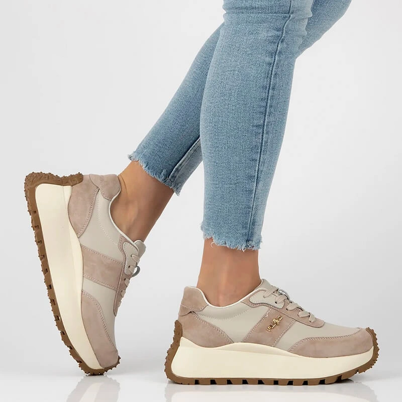 Casualowe damskie obuwie łączące elegancję skórzanej cholewki z wygodą podwyższonej podeszwy — neutralny beż ułatwia stylizowanie na co dzień.