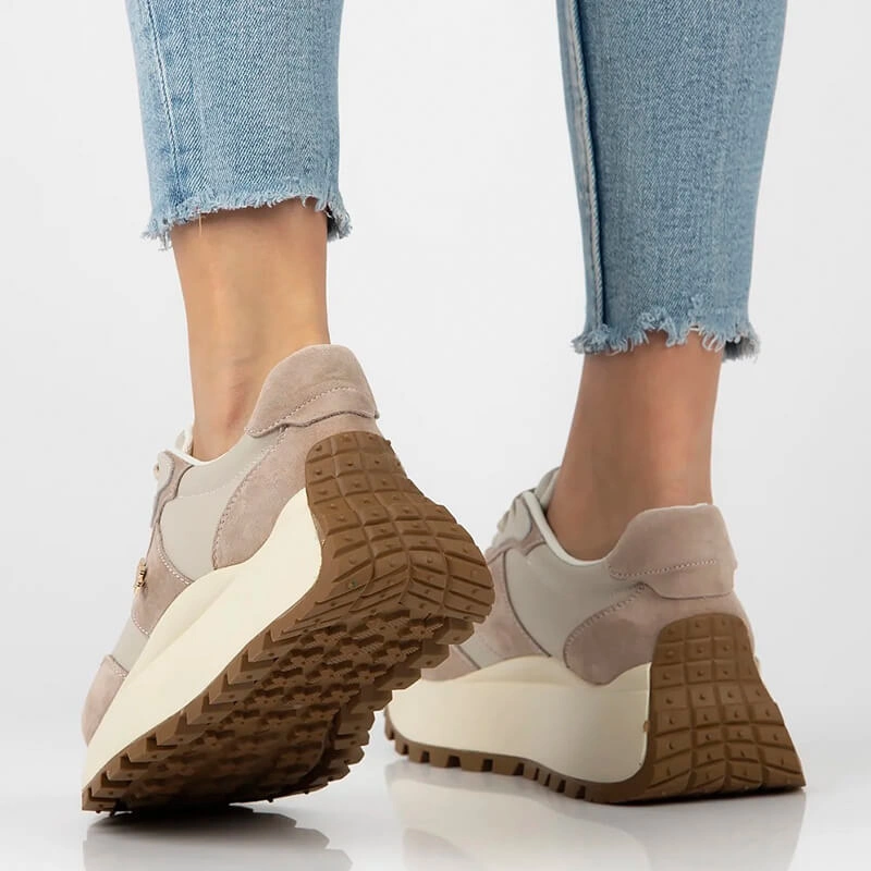 Beżowe skórzane sneakersy na platformie — wykończenie i stabilność