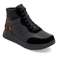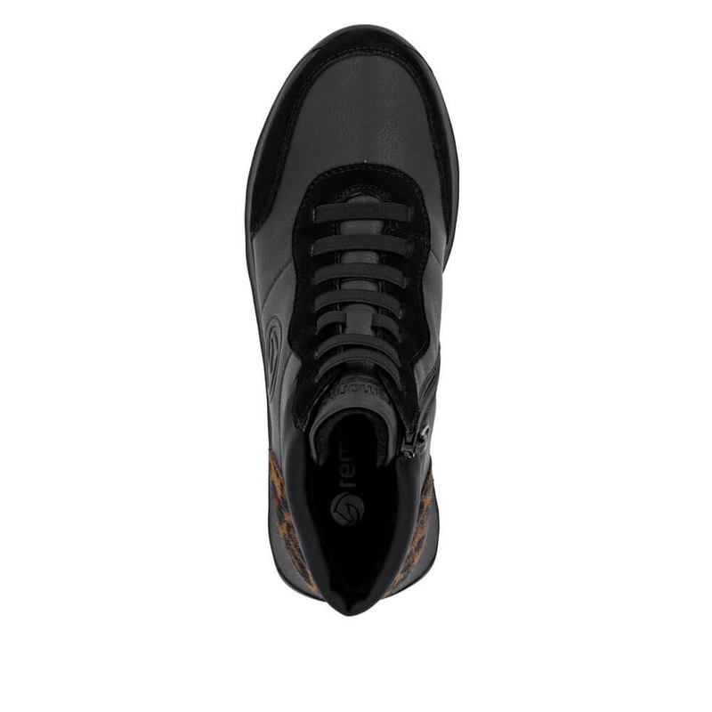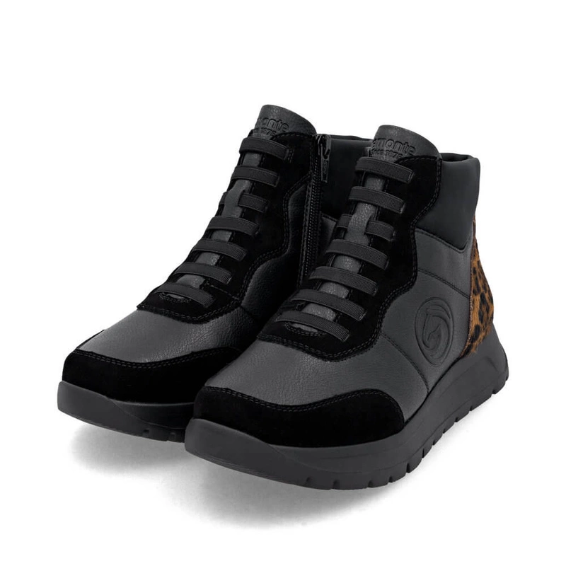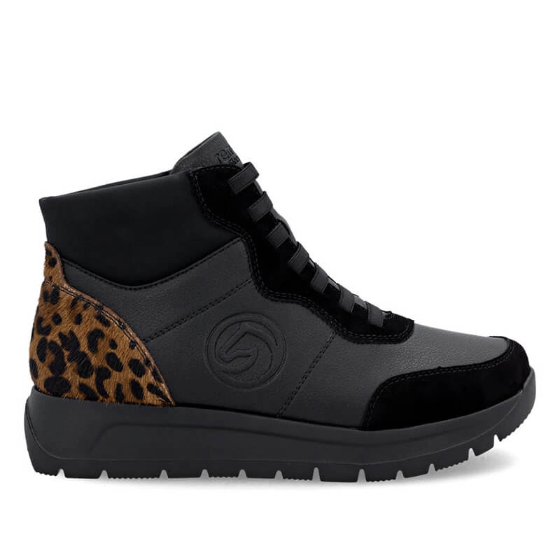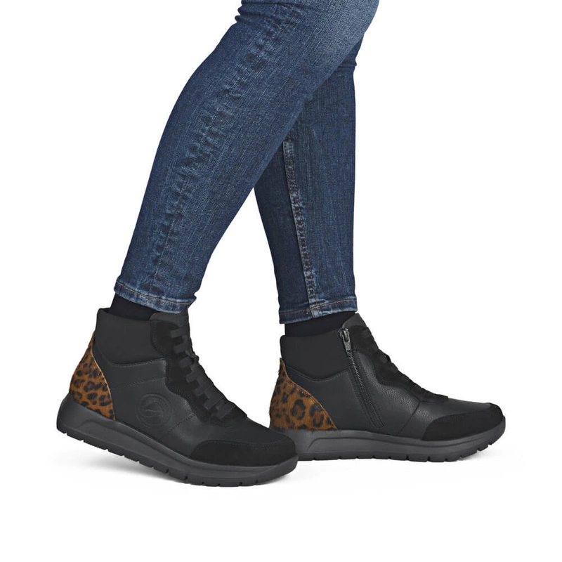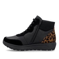 • Wygodne czarne botki damskie z panterką Remonte D2V70-03