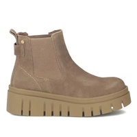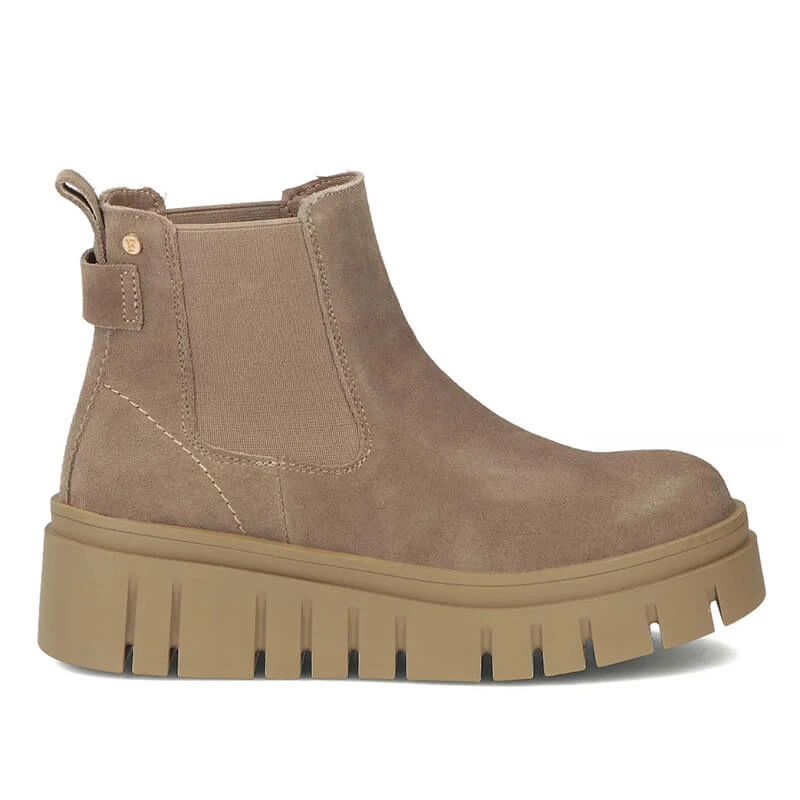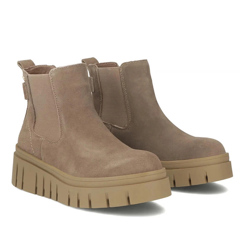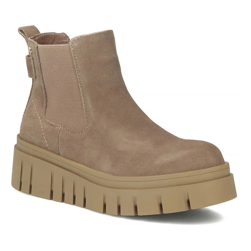 Rodzaj: botki; typ: podeszwa na platformie; kolory: beżowy i szary. Platforma dodaje pewności kroku i optycznie wydłuża sylwetkę, co dobrze komponuje się z rurkami i sukienkami midi. Idealne na miejskie spacerowe dni, weekendowe zakupy lub wyjście na kawę, gdy zależy Ci na modnym, a zarazem zrównoważonym looku.