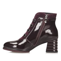 Bordowe lakierowane botki damskie z zamkiem — materiał i kolor w stylowych zestawieniach