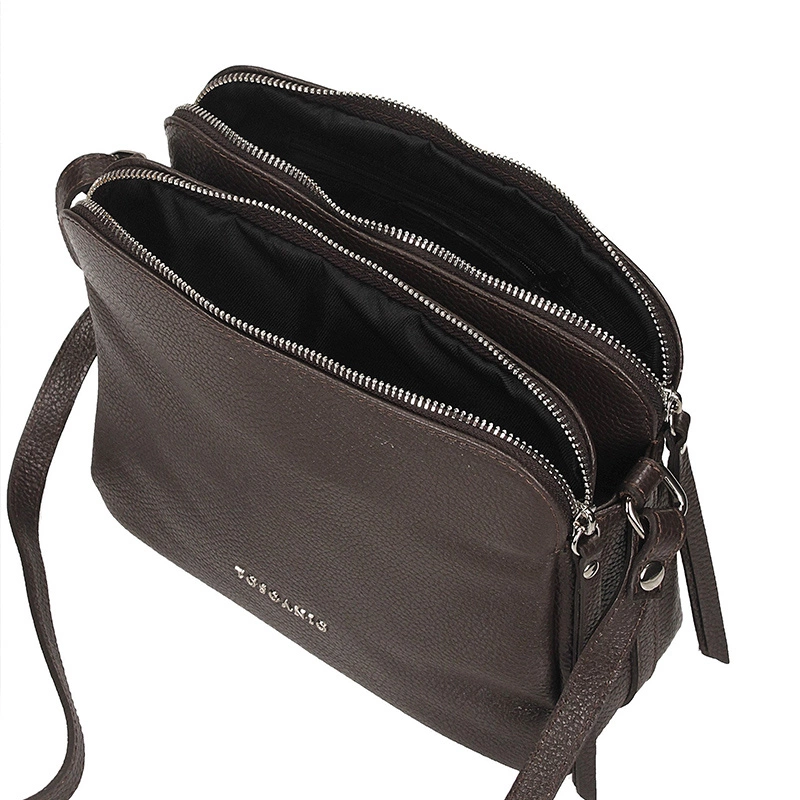 Włoska torebka listonoszka Toscanio to połączenie ponadczasowego stylu z jakością naturalnej skóry, która gwarantuje zarówno trwałość, jak i luksusowy wygląd. Brązowy kolor świetnie komponuje się z codziennym strojem, a wytrzymała skóra sprawia, że torebka doskonale sprawdzi się podczas załatwiania spraw na mieście czy podczas wyjścia do pracy. Przykład: dzięki solidnemu wykonaniu możesz bez obaw nosić ją na co dzień – zarówno do eleganckiej sukienki, jak i casualowych jeansów.