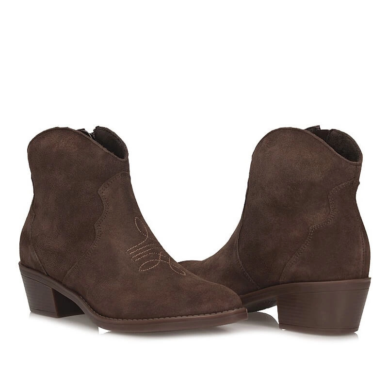 Botki kowbojki w odcieniu ciepłego brązu wykonane z wysokiej jakości zamszowej skóry naturalnej to propozycja dla kobiet ceniących zarówno wygodę, jak i elegancję. Doskonale sprawdzą się w stylizacjach casualowych – możesz je założyć do jeansów podczas weekendowych spacerów, jak i do zwiewnej sukienki na spotkanie z przyjaciółmi. Ich uniwersalny kolor i modny fason świetnie wpisują się w aktualne trendy, a zamszowa faktura dodaje charakteru każdemu zestawowi.
