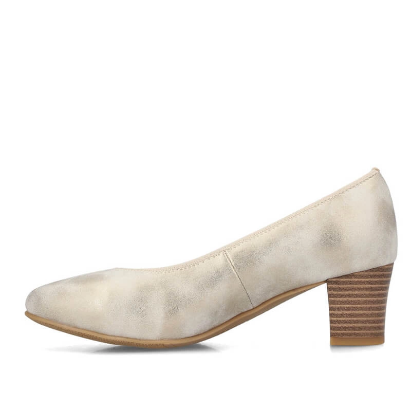 Damskie czółenka na obcasie — złote i beżowe