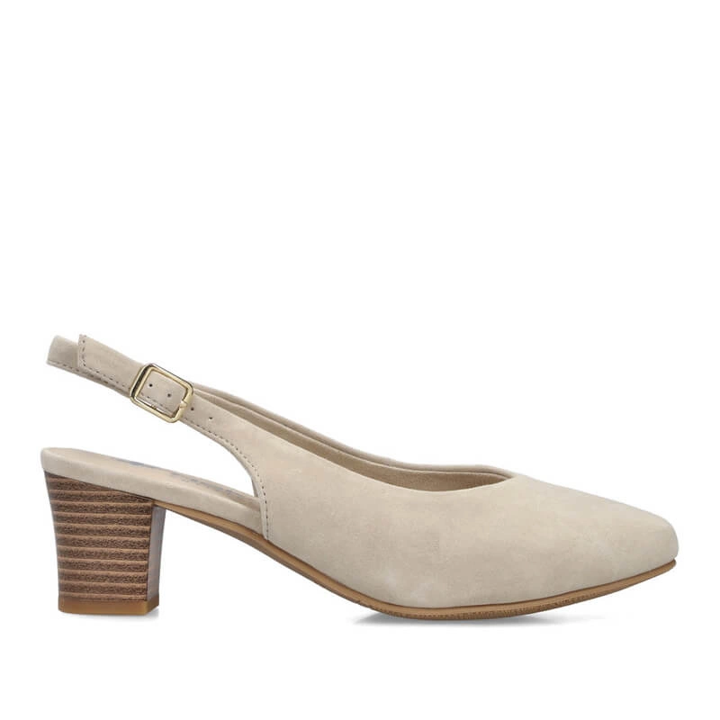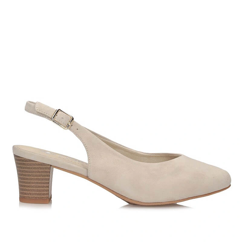 Czółenka z odkrytą piętą w kolorze beżowym — skóra zamszowa i 6 cm obcas